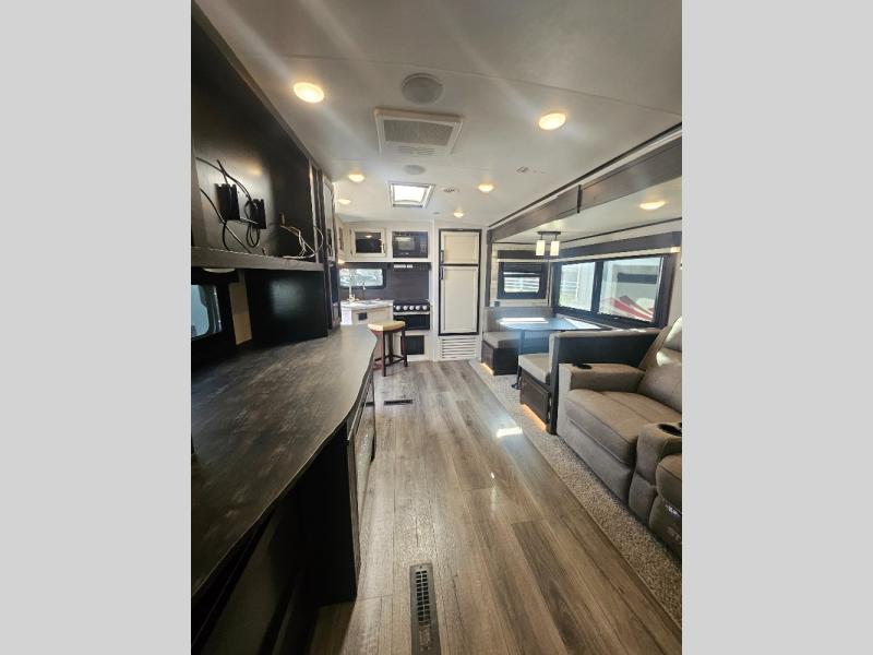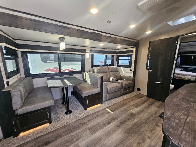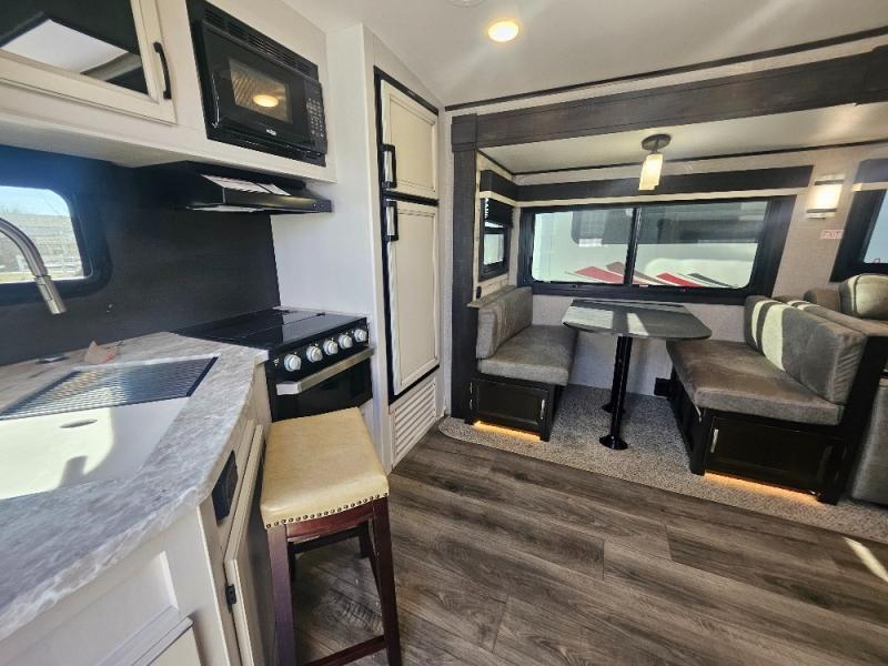For worry-free family fun, take your next adventure in this White Hawk travel trailer. The booth dinette and tri-fold sofa add plenty of seating space to the living area so that you can enjoy a movie night on the 40" LED TV with the whole family, and the rear kitchen with a three-burner recessed cooktop with oven gives you the perfect space to create those movie-night snacks everyone loves. The walk-through bath gives you the extra room that you need as you get ready for the day, and the skylight brightens up the entire space with the sunshine that it brings in each morning. Because this trailer has two entry doors, the front bedroom is able to have its own private entrance to and from the trailer.