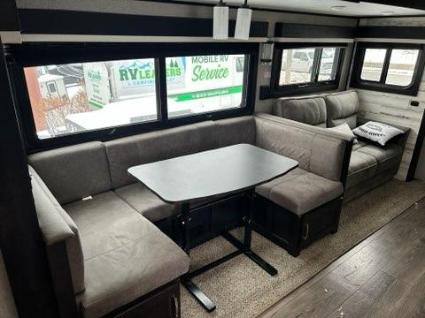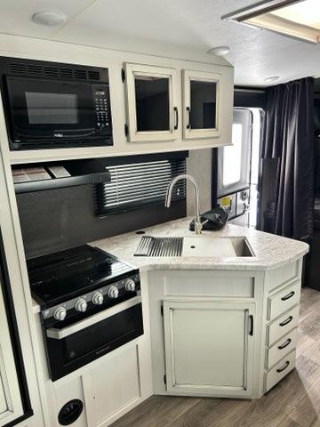 Owning this White Hawk travel trailer means that you own a trailer which provides greater peace of mind and added comfort. From the smallest of details, such as a decorative kitchen backsplash and arched ceilings, to the most noticeable inclusions, like a private bedroom, this trailer has included everything you will need for a successful and reliable adventure. The addition of double-size bunks and a U-shaped dinette gives this trailer the ability to sleep ten people, and the included outdoor kitchen gives you the ability to feed those people.