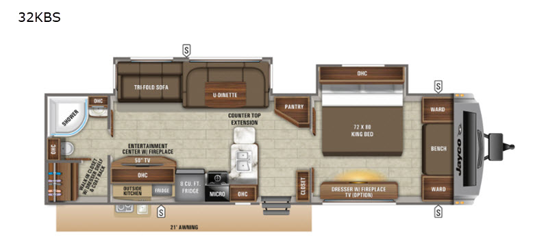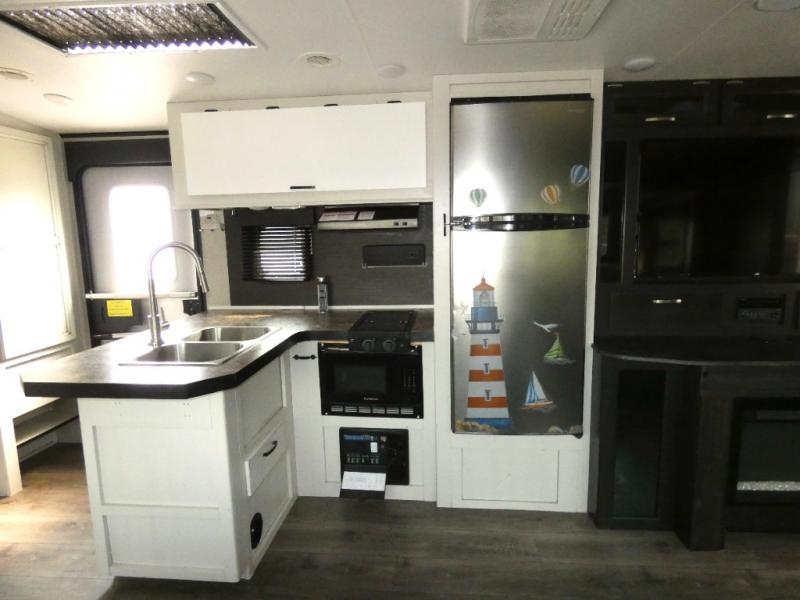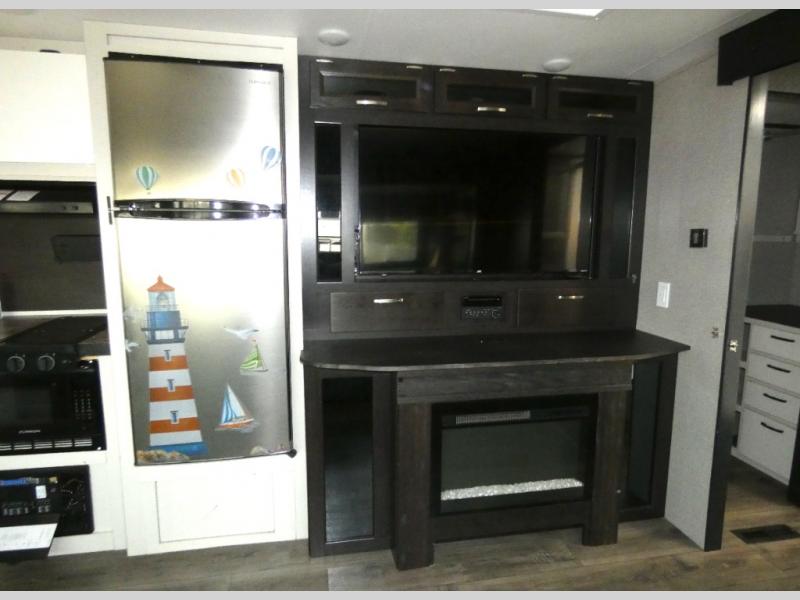 If you're looking for a travel trailer to give you that home-away-from-home feeling, then this Jayco White Hawk travel trailer is for you! It features a front private bedroom that has an arched entry and a bench with wardrobes on either side. The U-shaped dinette is the perfect place for you to enjoy your meals or convert into an extra sleeping space at night, and you can enjoy the outdoors to its fullest even while you're cooking your meals thanks to the outdoor kitchen. When you're ready to wind down the night, you can do so comfortably in front of the cozy fireplace.