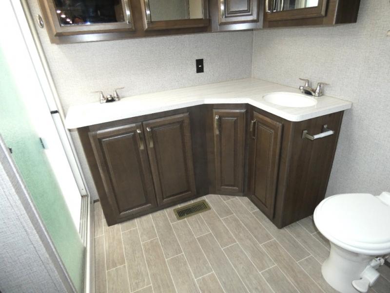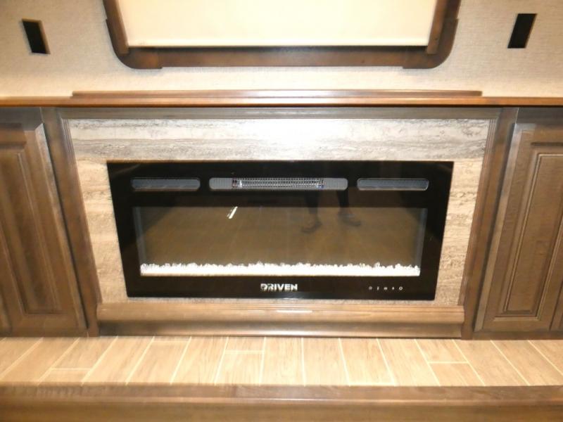 Come see just how fun and easy camping can be with this luxurious five-slide Alpine fifth wheel by Keystone RV. Getting ready for the day is easy with a large master bathroom that has two sinks, plenty of counter space, and a shower. You'll find the second half bathroom is conveniently located just off of the kitchen for your guests. In the kitchen area, you will find dual opposing slides and all of the amenities you need to fix your favorite meals, such as a convection microwave, and an 18 cubic foot refrigerator. Step up to the front living room where you will find two tri-fold sofa sleepers, theater seats, a fireplace, and an entertainment center with a 50" LED TV.