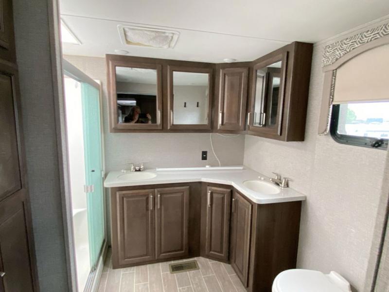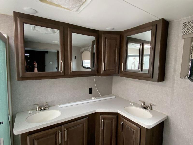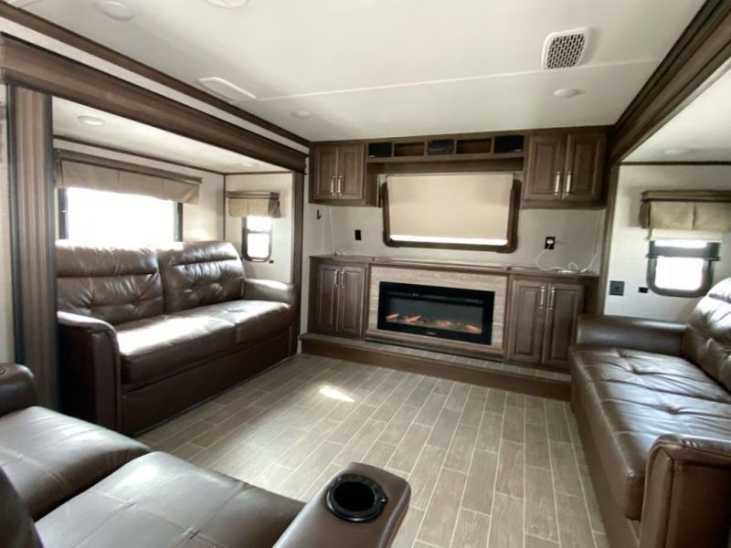 Come see just how fun and easy camping can be with this luxurious five-slide Alpine fifth wheel by Keystone RV. Getting ready for the day is easy with a large master bathroom that has two sinks, plenty of counter space, and a shower. You'll find the second half bathroom is conveniently located just off of the kitchen. In the kitchen area, you will find dual opposing slides and all of the amenities you need to fix your favorite meals, such as a convection microwave, and an 18 cubic foot residential refrigerator. Step up to the front living room where you will find two tri-fold sofa sleepers, theater seats, a fireplace, and an entertainment center with a 50" LED TV.