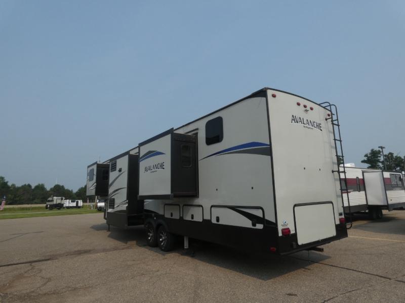 Don't waste another moment on dull adventures when you can have exciting and memorable trips each and every time you take this Avalanche fifth wheel with you to the lake! This marvelous unit has all of the space you need to relax comfortably inside on rainy days with five slides that give you enough room for separate living quarters all throughout. From the rear master suite that contains a king-size bed and large bathroom to the central kitchen/dining area that has a massive pantry which will store any canned good imaginable, you will adore how accommodating and functional every room will be for your family.