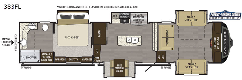 With any Keystone Avalanche fifth wheel, you will enjoy getting to your favorite destination with the exceptional turning radius from the MAX TURN high-gloss fiberglass front cap, as well as the Road Armor suspension. Once you have arrived at your destination, the One Place Command Center with its centrally located operational switches and gauges will allow you to set up your RV quickly, and the one-touch electric awning with adjustable arms will provide protection from the sun and weather while you load your clothing, dishes, and gear into all of the interior storage compartments.