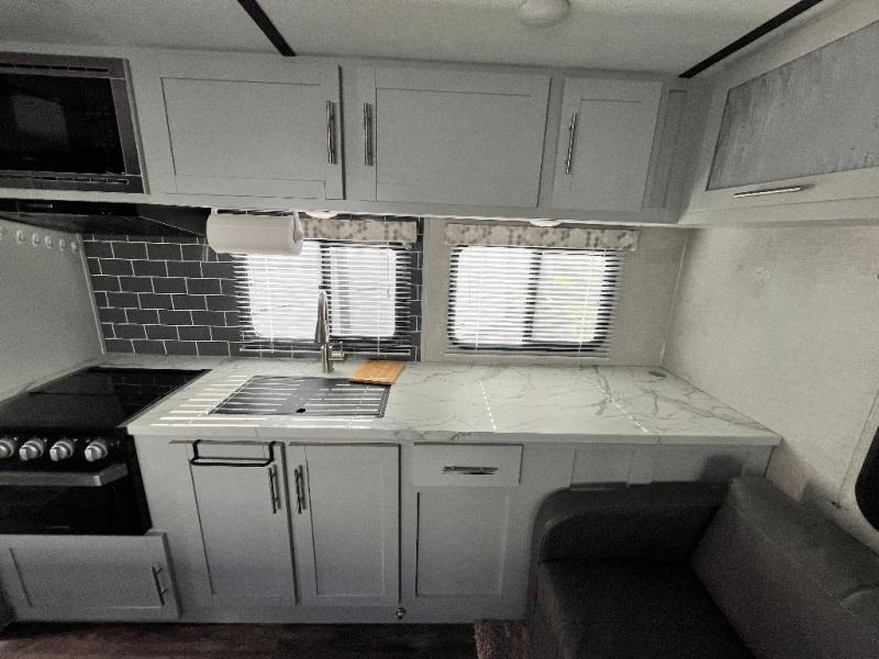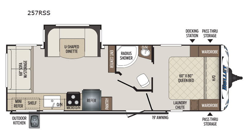 Are you ready to experience the camping trip of a lifetime? If so, load up your family and set out in this Bullet travel trailer. Meal prep has never been easier than with the two kitchens that have been included in this model. With both an indoor and outdoor kitchen, you can do it all. Inside of this unit you can visit with your family and friends on the U-shaped dinette or the 68" sofa which can both be transformed into extra sleeping space each night, and the private master suite will deliver the relaxation you deserve as you drift off to sleep each evening.