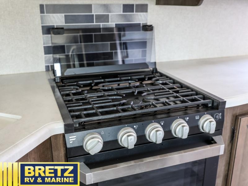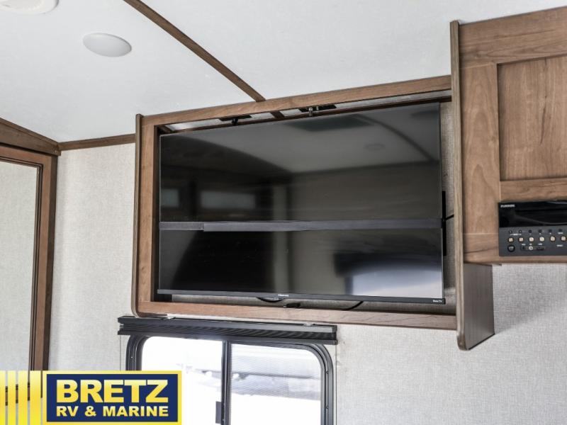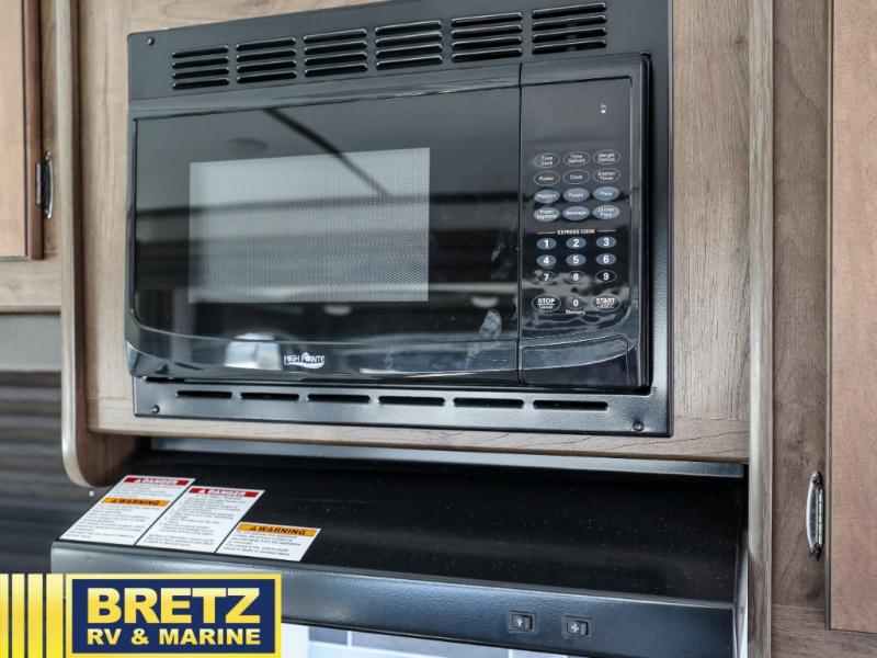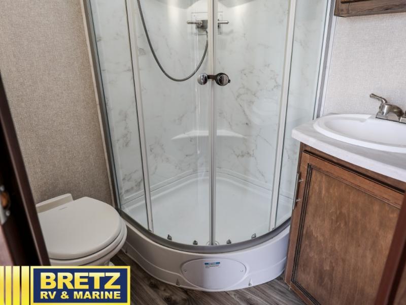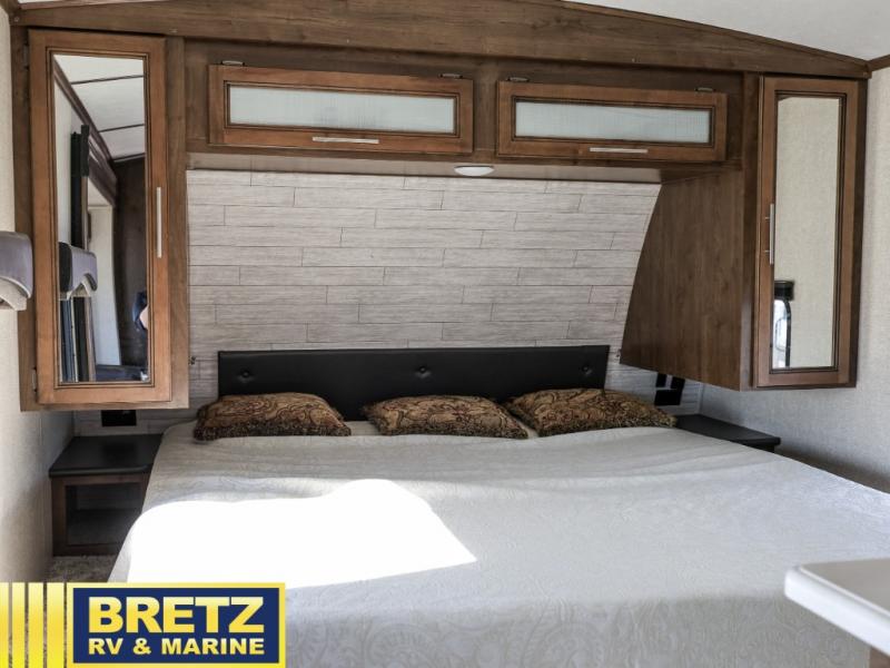 Imagine waking up from your own king bed to enjoy a hike, a bike ride, or a relaxing time outside under the 16' power awning while you wait for your spouse to wake up. With this Cougar Half-Ton travel trailer, you can make breakfast inside with full amenities and eat at the U-shaped dinette while looking out at the views. You will be able to get cleaned up in the full bathroom without having to wait your turn for the public facilities. Plus, there is a privacy curtain for the bedroom so that you have an additional place to get ready, and the bar top gives you extra room to sit down with a hot meal.