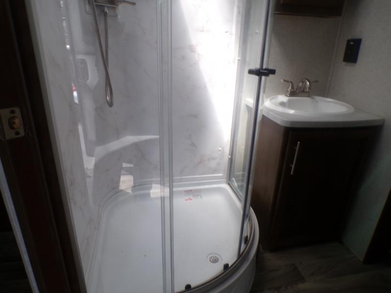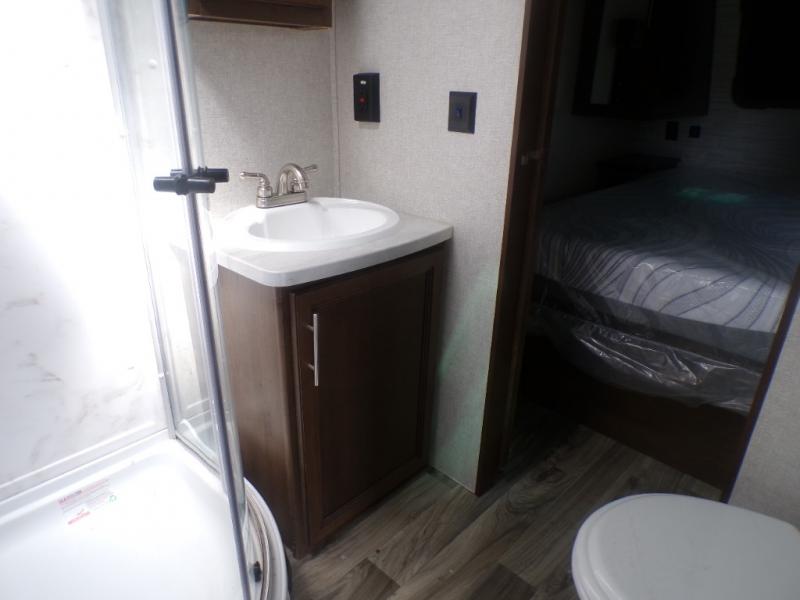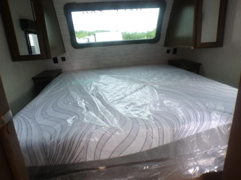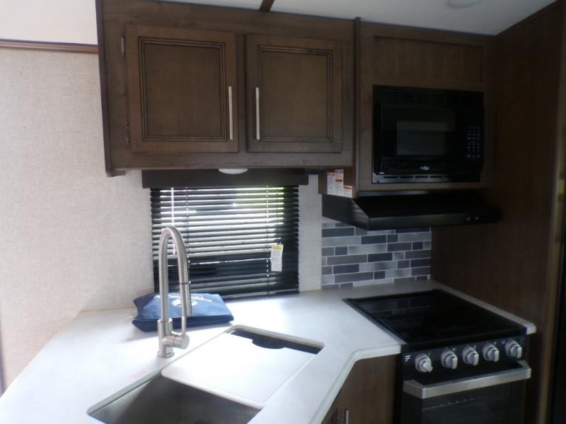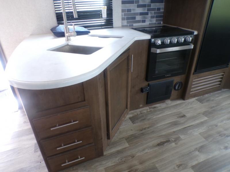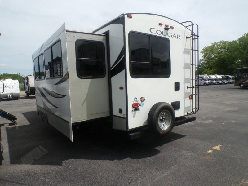 As you explore all that nature has to offer, you'll appreciate all that this Cougar Half-Ton travel trailer has to offer, as well! A master suite up front will provide the ultimate luxury as you drift off to sleep each night, and you'll be able to conveniently sneak into the radius shower when you wake up in the morning. Choose to prepare breakfast outside underneath the sunshine at the outdoor grill, and if you need a little shade while you eat, the 16' power awning will do the trick.