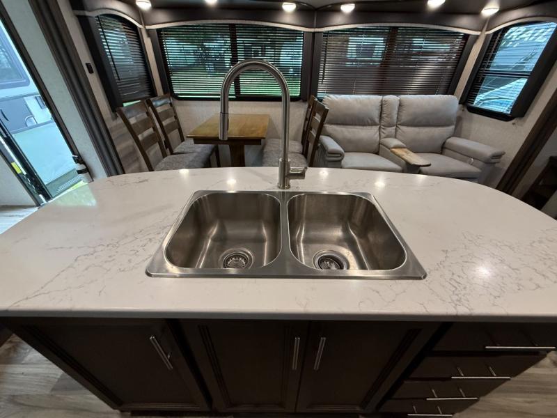A kitchen island with a gourmet sink and chef's sprayer faucet creates an inviting space in which to prep dinner each evening with this Cougar Half-Ton travel trailer! Not only that, but this model also comes with a 21" Furrion range with Piezo ignition and microwave oven so that you can have all of the same dishes you love to make at home. The front private bedroom is spacious and accommodating with its king bed slide, full-length wardrobe, and dresser, and the rear living area is just as great because it has an entertainment center that everyone can watch from the comfort of the theater seating or sleeper sofa.
