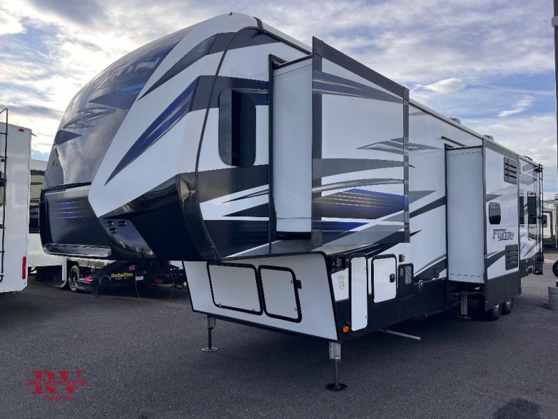 Take life by the horns with any one of these Fuzion fifth wheel toy haulers by Keystone! The Tuf-Lok A/C duct joiners feature a crush resistant design that securely joins the ductwork and the A/C units to help reduce any chilled-air leaks, boosting cooling efficiency and comfort. There are also in-floor heating ducts to evenly distribute the heat and color-coded wiring to simplify the electrical and entertainment troubleshooting systems. The Tru-Fit slide construction creates a more durable slide room to minimize any structural stress and resists leaking. With the Jensen entertainment package, each Jensen component is strenuously tested to endure vibration, UV exposure humidity, and temperature fluctuation so that you can have long lasting entertainment where ever the road takes you. Don't wait any longer, come choose your favorite model today!