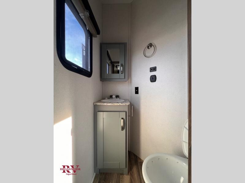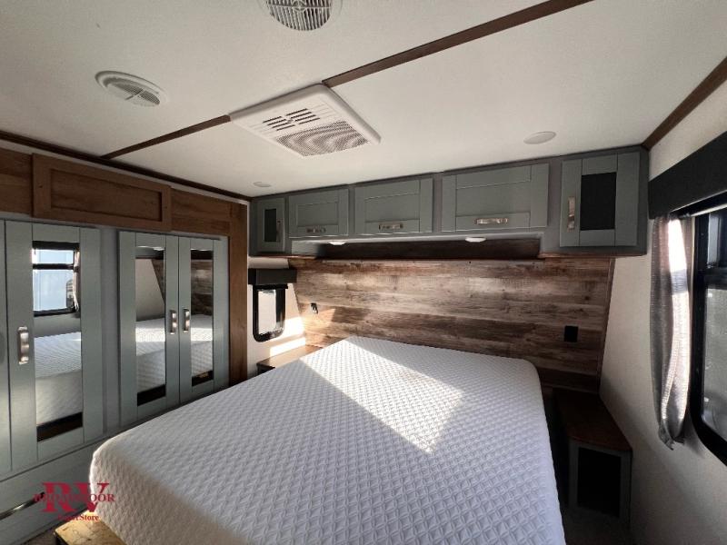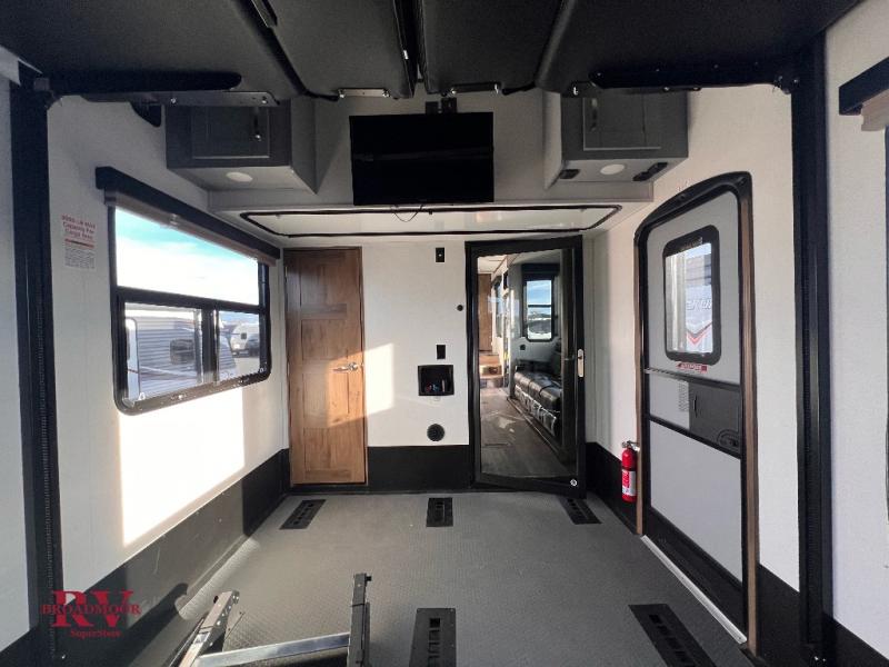 You can't go wrong camping in this toy hauler! There won't be any excuse not to stay clean with the bath and a half. Eating your meals will be comfortable and fun at the center table with four swing out stools to sit on and the slide out sofa is big enough to seat four people or for one to spread out and take a quick afternoon nap. You will also enjoy all of the entertainment inside with the two LED TV's and the fireplace. This model features a front master suite with a slide out queen bed, a master closet, and a space prepped to add a washer and dryer if you choose.