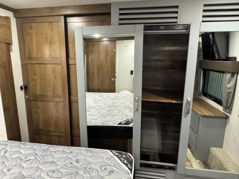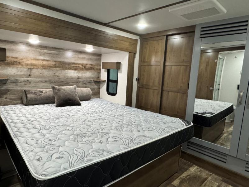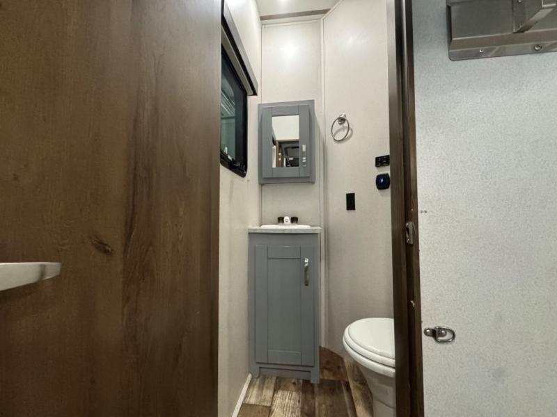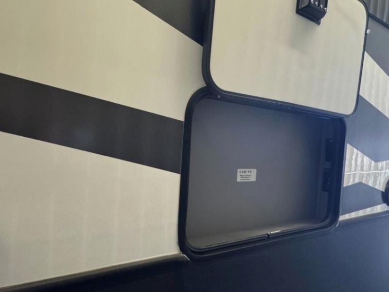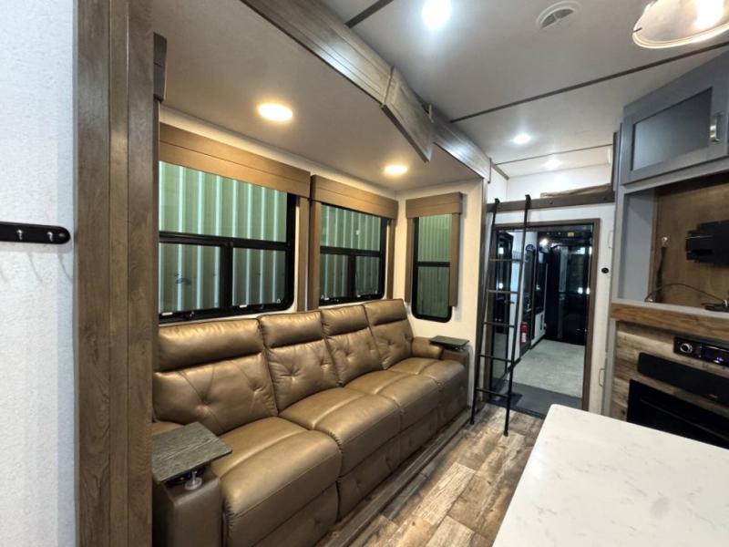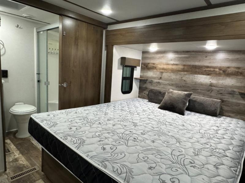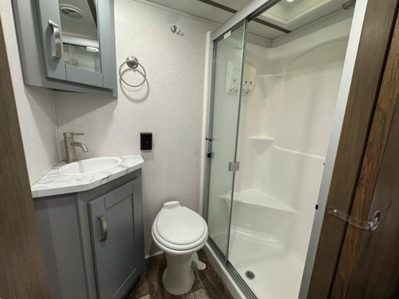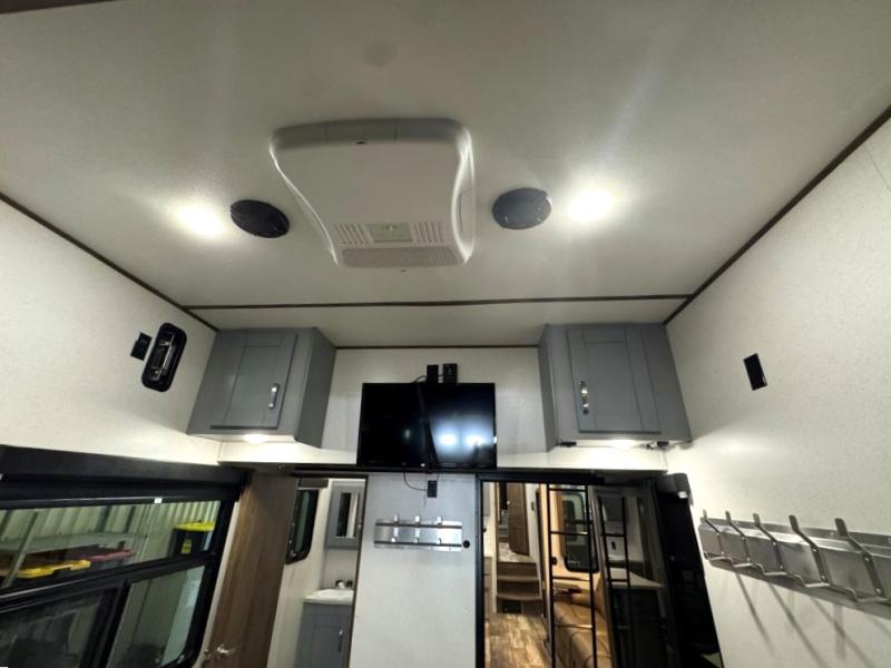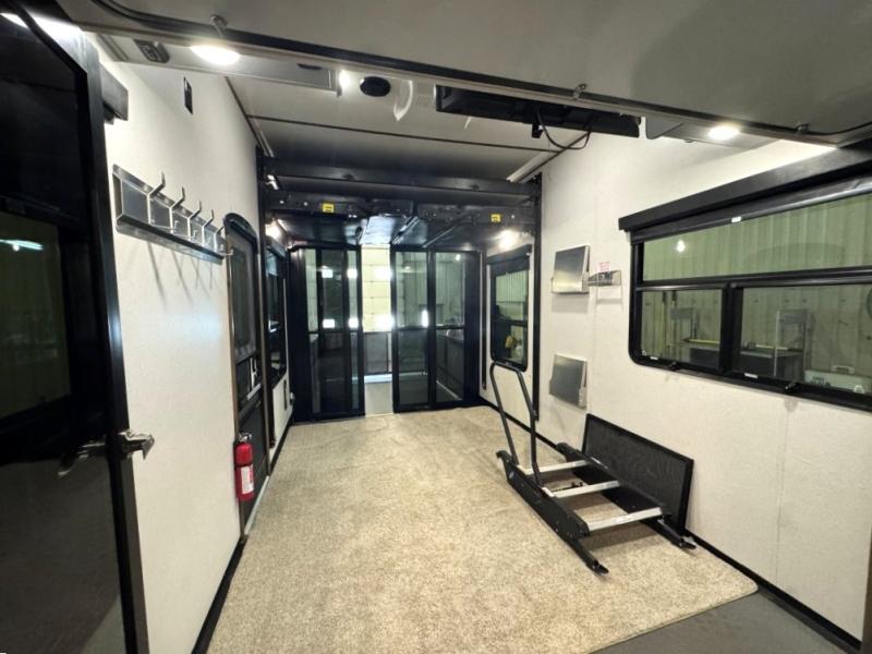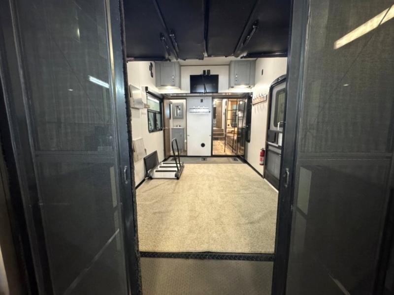 Once you step inside this toy hauler you won't want to camp any other way! The front private bedroom has a residential queen bed that can be switched out for the optional Fuzion king bed instead, a large wardrobe slide out to keep your hang up clothes, and your very own access into the dual entry bathroom. Inside the bathroom, you will find everything you need to get squeaky clean each morning including a skylight above the residential shower with a seat for added natural lighting. The center table with four swing out stools is sure to be a hit and the four person sofa slide out is the perfect place to relax while you enjoy watching your favorite movie on the LED TV!