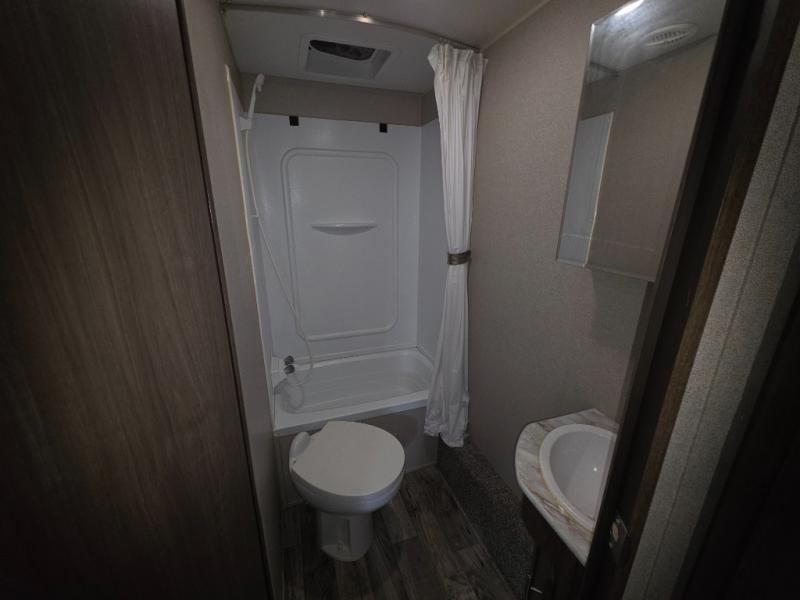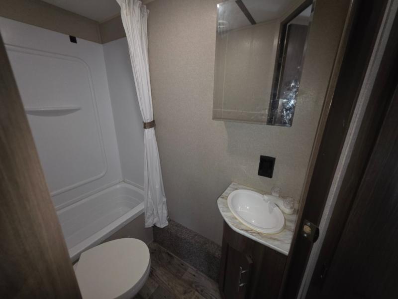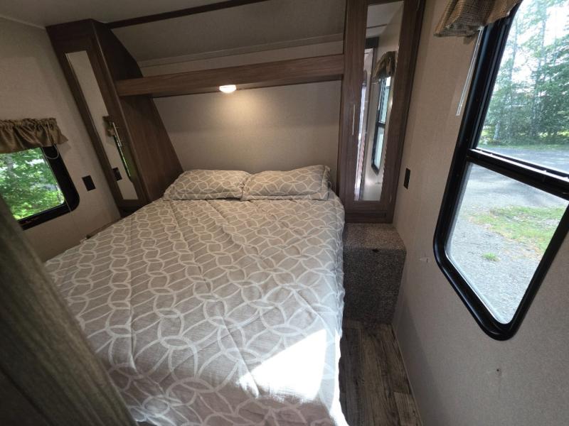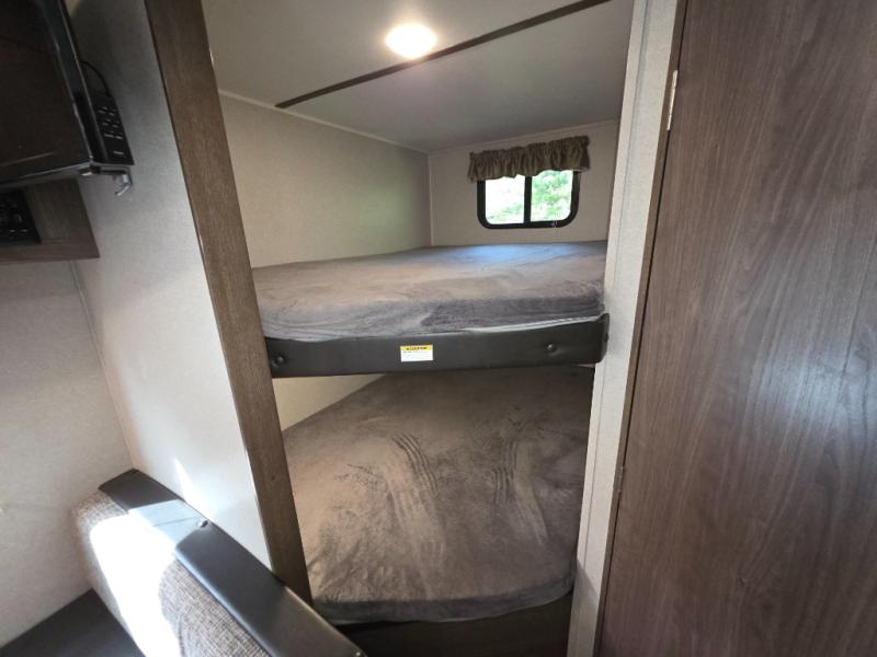 With sleeping for nine, this Keystone Hideout is the perfect camper for a larger family to enjoy. This model offers a full bathroom where you can easily and privately get ready for the day. Sleeping space for everyone can be found with the set of double-size bunks, a queen-size bed in the private bedroom, a booth dinette, and a sofa. Throughout this model you will find shelf space, as well as overhead cabinets for all of your extra camping items, and the two bedroom closets will come in handy for holding onto those extra sweaters and hiking boots. In the evening if the weather is nice, you will want to sit out under the lighted adjustable power awning and enjoy the scenic sunset together!