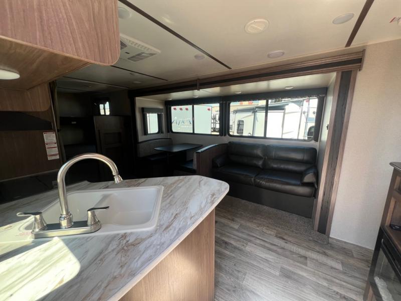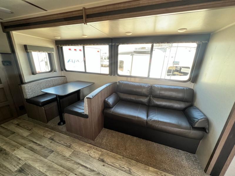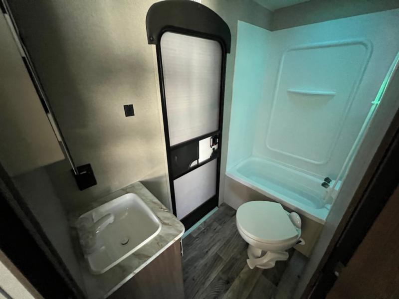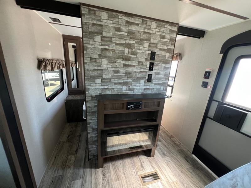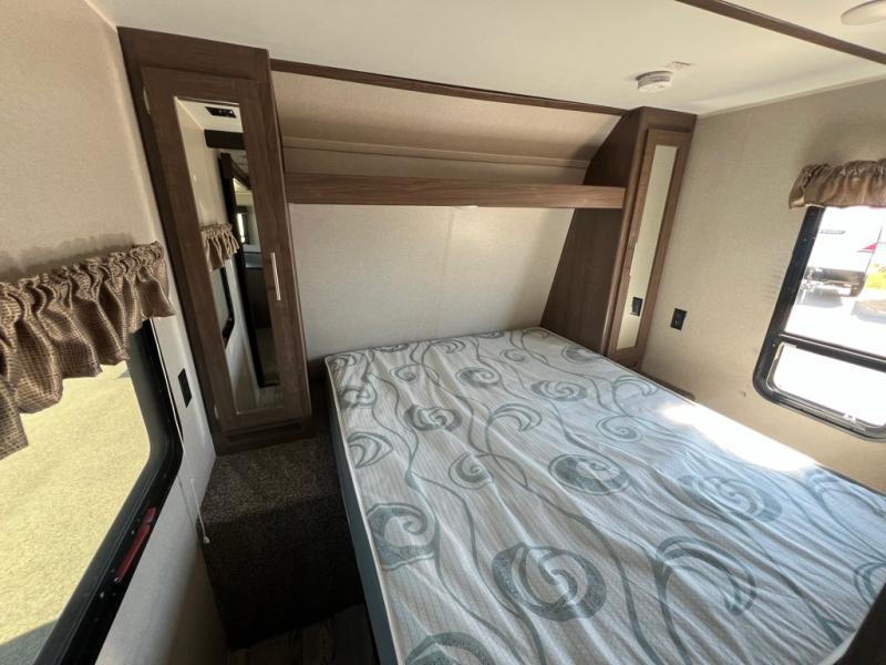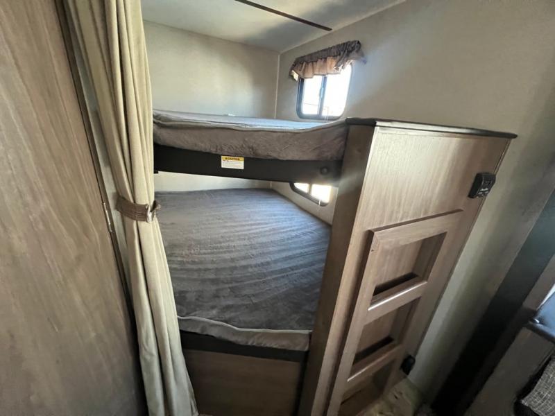 With sleeping for nine, this Keystone Hideout is the perfect travel trailer for a larger family to enjoy. This model offers two entry doors so that you can easily slip out in the early morning and head out on a fishing trip, or you can use the rear entrance door to directly enter the bathroom from outside instead of walking through the entire trailer. Within the single slide is a booth dinette and a sofa which are both great for lounging during the evening and sleeping at night, and your kids or guests will enjoy the set of double-size bunks. Along either side of the entertainment center are two accordion doors which close off the front bedroom and add just the right amount of privacy.