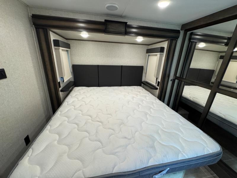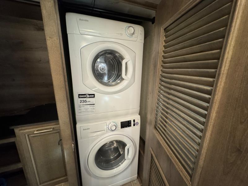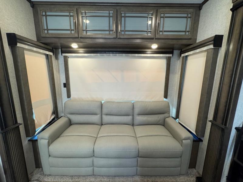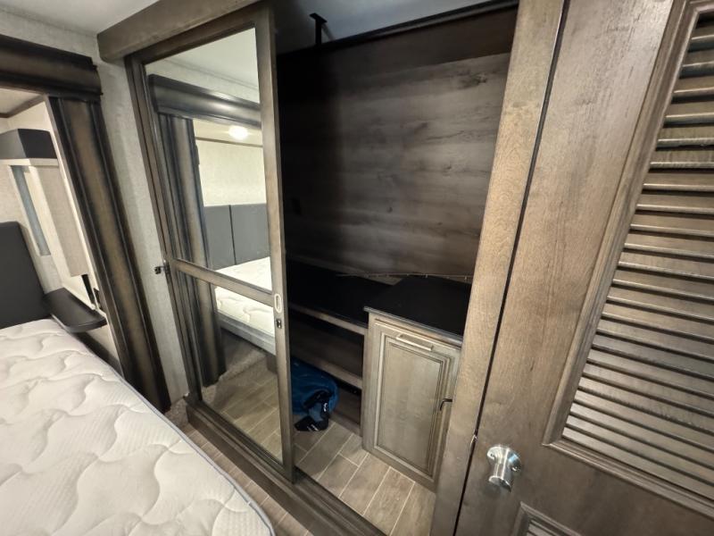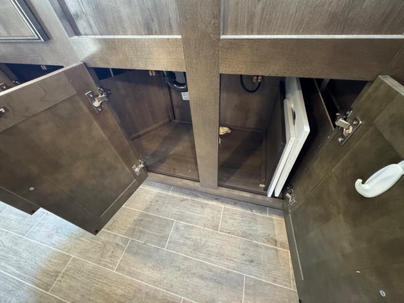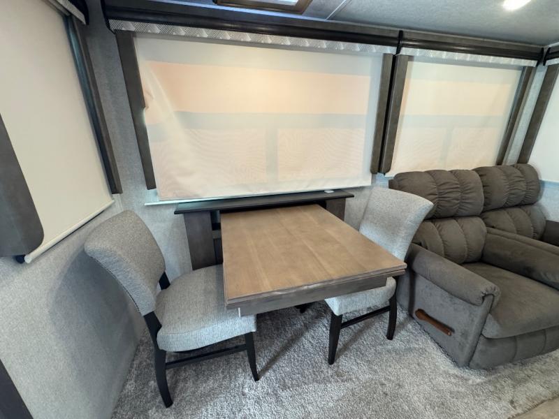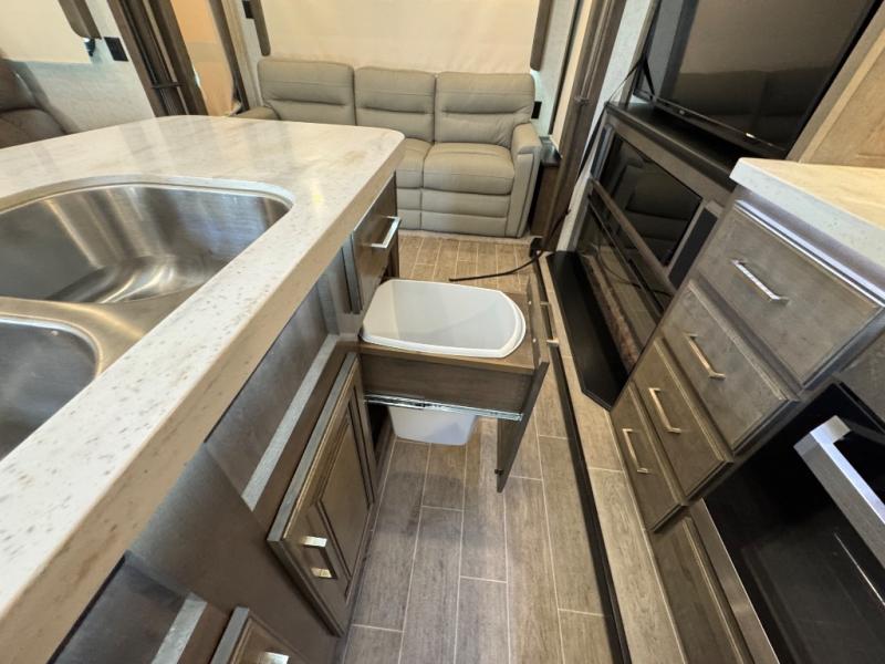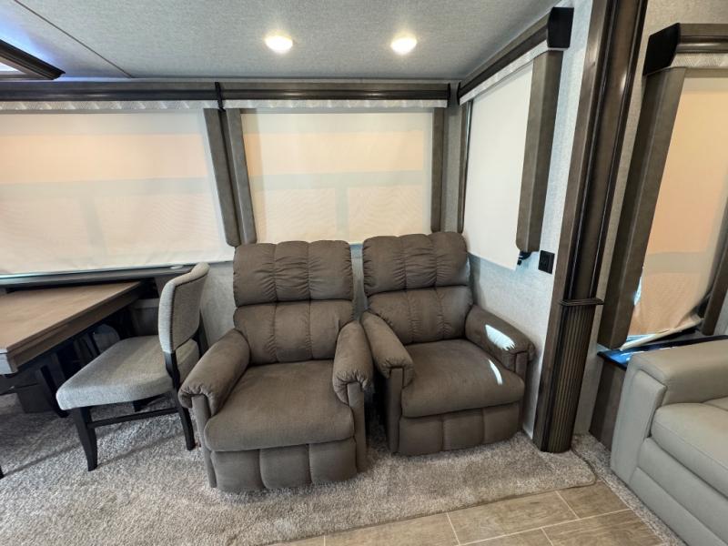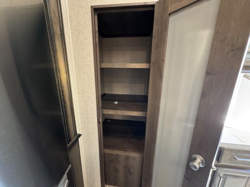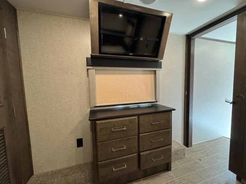 Watch your favorite show from the power theatre seating or the hide-a-bed sofa while the chef prepares a meal in the full kitchen including an island, a pantry, and a coffee station. The convection microwave will probably be a favorite appliance for many. You will also love your master bedroom with a slide out queen bed or choose an optional king, plus you will have plenty of storage for everything under the bed, within a dresser, and inside the closet up front. There is a space to add a washer/dryer option and the barn door into this room offers style and saves space. You may like to relax outside with protection from two awnings, and the 2" towing hitch might come in handy as well.