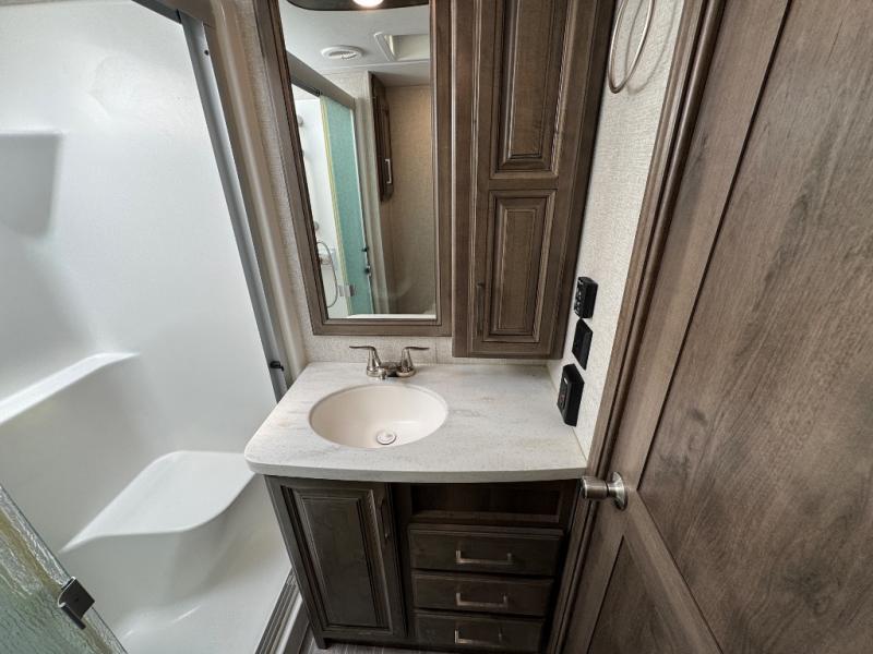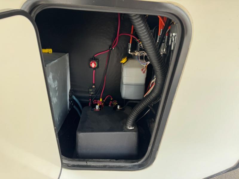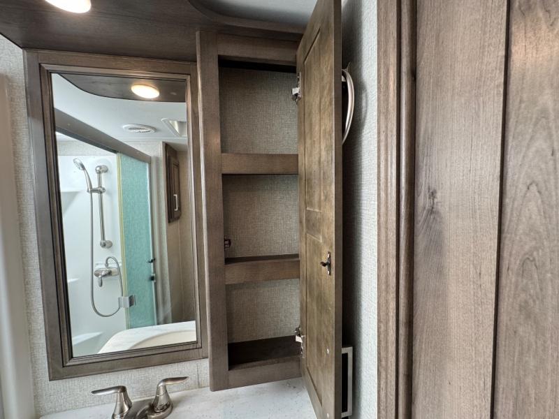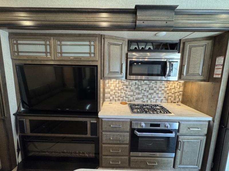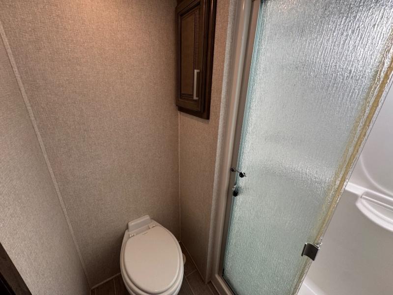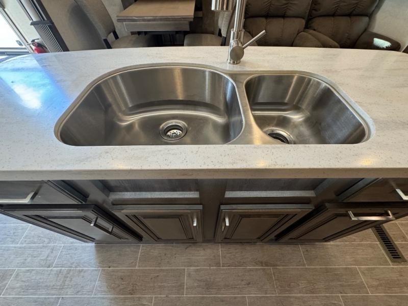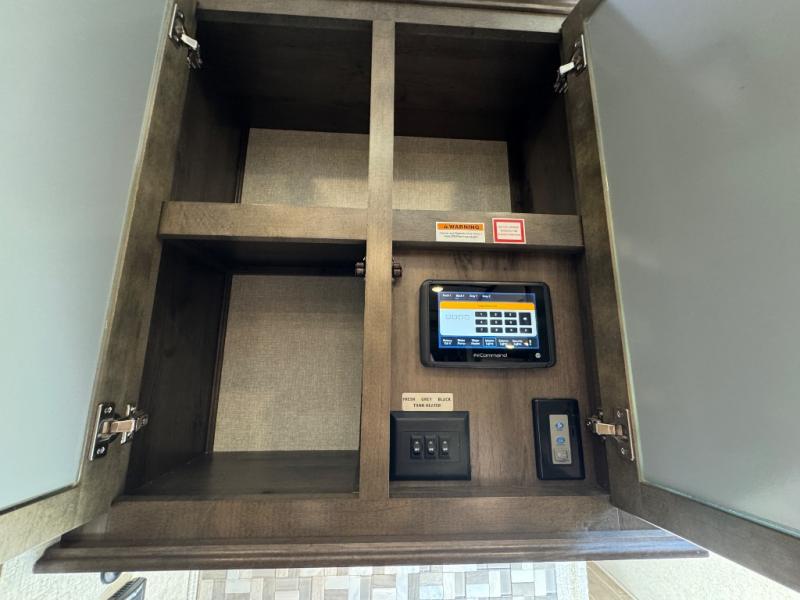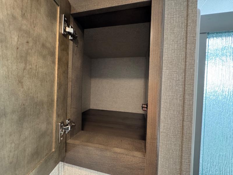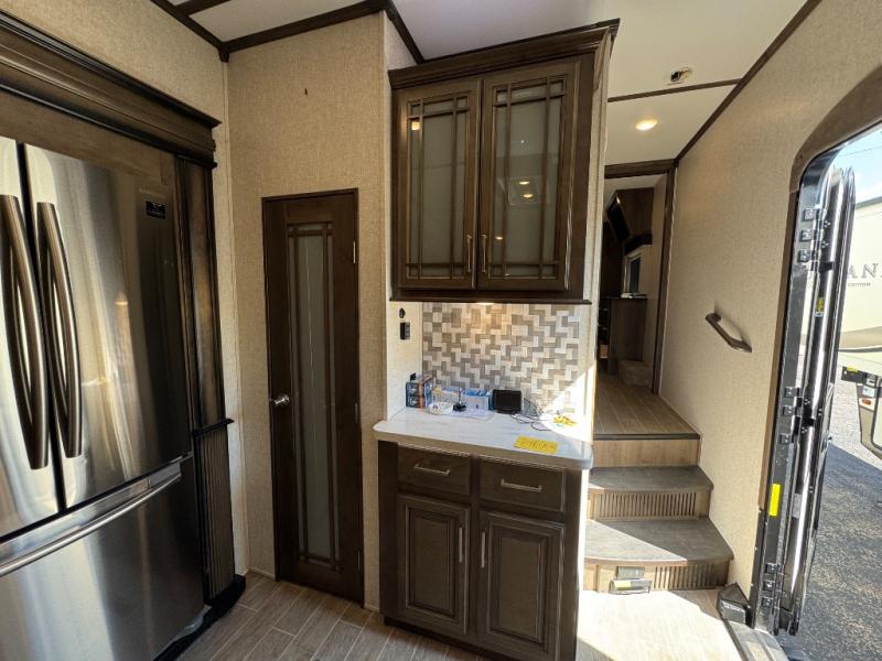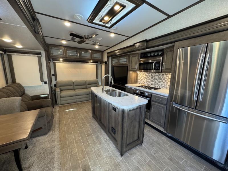 Watch your favorite show from the power theatre seating or the hide-a-bed sofa while the chef prepares a meal in the full kitchen including an island, a pantry, and a coffee station. The convection microwave will probably be a favorite appliance for many. You will also love your master bedroom with a slide out queen bed or choose an optional king, plus you will have plenty of storage for everything under the bed, within a dresser, and inside the closet up front. There is a space to add a washer/dryer option and the barn door into this room offers style and saves space. You may like to relax outside with protection from two awnings, and the 2" towing hitch might come in handy as well.