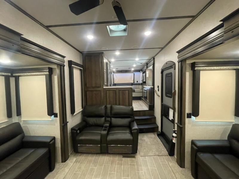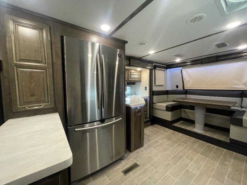 You can cozy up near the fireplace on one of the two hide-a-bed sofas or the theatre seats with power recliners to watch a show before retiring to your master bedroom when camping in this fifth wheel. Easily slide the bedroom barn door closed as you appreciate the extra space offered by this stylish feature. When you are ready to make a meal, the front kitchen offers everything you will need plus a pull-out pantry, a pull-out counter for more prep space, and a beautiful view out the patent-pending front windshield. You will surely enjoy eating at the U-shaped dinette while you gaze outside at the scenery before heading outdoors to relax under one of the two awnings. You can even take your golf clubs, fishing poles, and larger camping items thanks to the exterior slide-out storage tray.