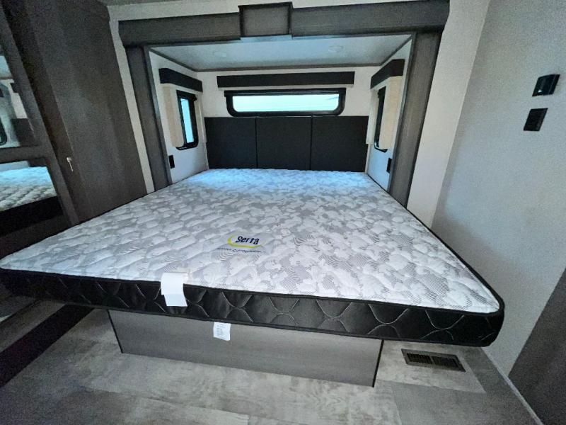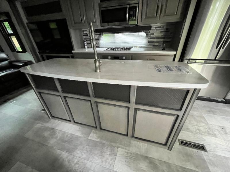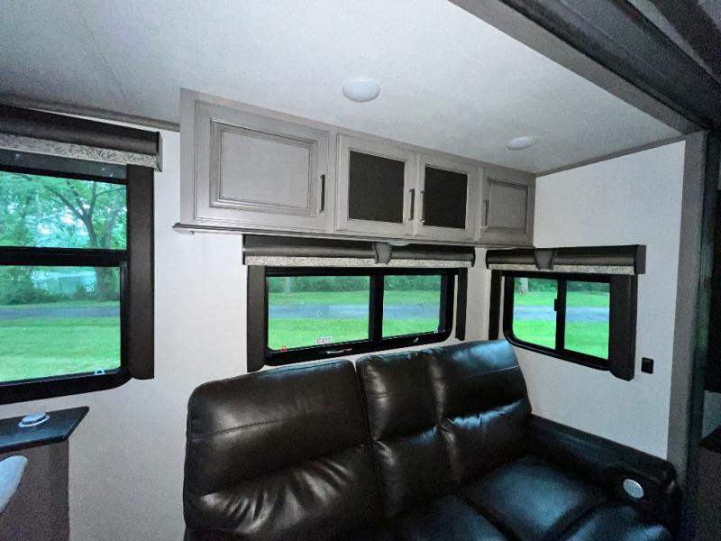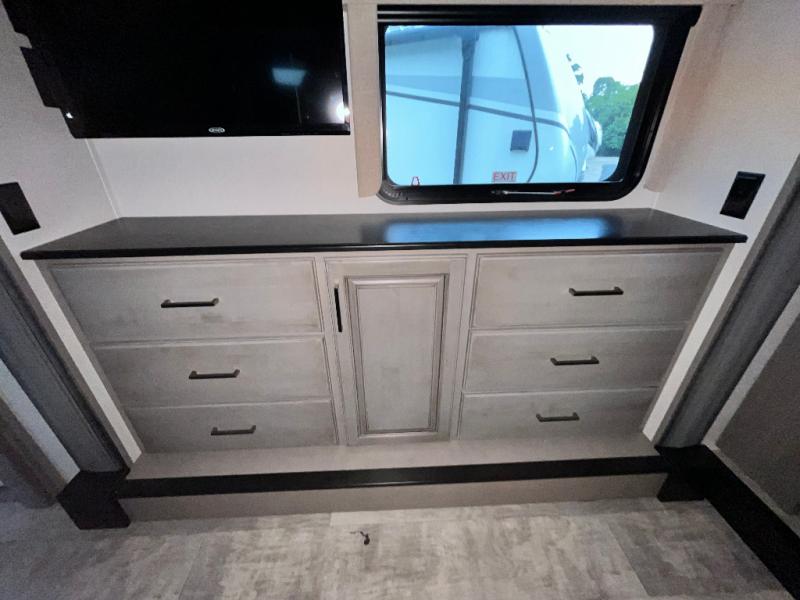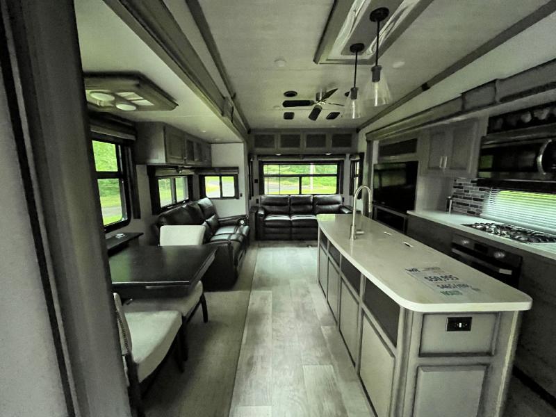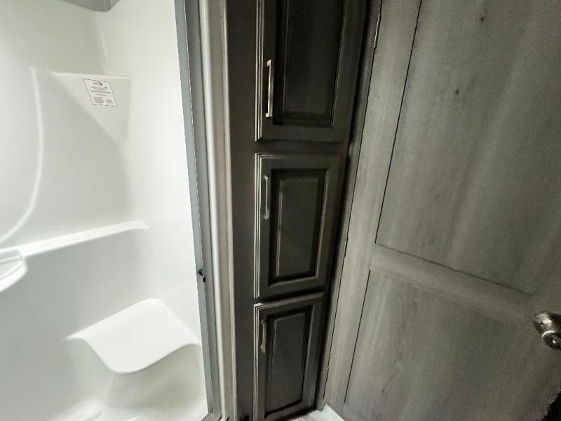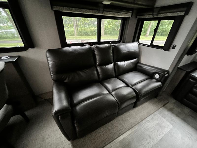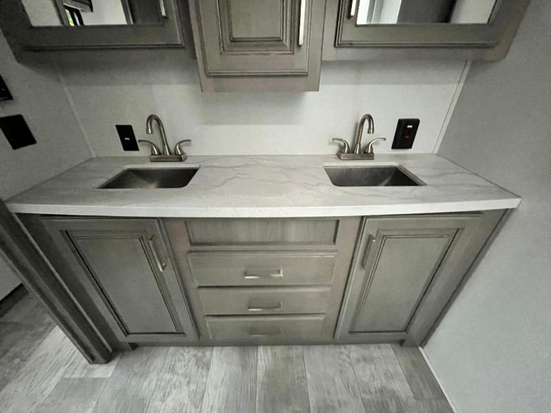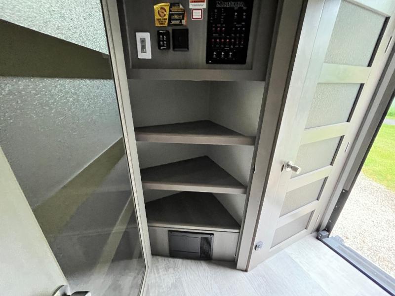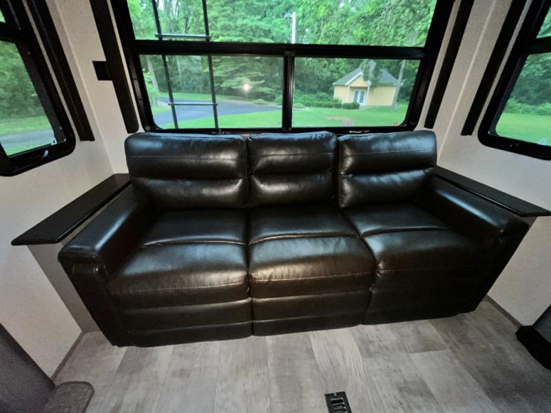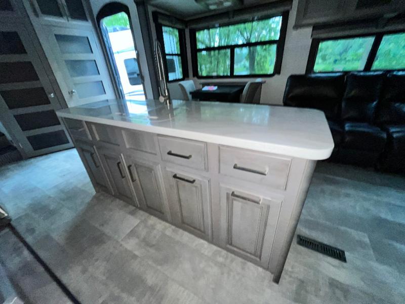 The chef is going to love the kitchen layout with a center island, dual slides in this area offering lots of prep space, a convection microwave, an 18 cu. ft. residential refrigerator, and a large pantry. You will find a handy entry closet nearby that you can add a washer/dryer option if you like to keep everything clean while away from home. The rear living area offers a hide-a-bed sofa giving you more sleeping space for guests, and the theatre seats with power recliners might be your favorite spot. If you aren't outside under one of the two awnings, you can work or dine at the free standing dinette. The master bedroom offers a slide out queen bed or choose a king bed option, a barn door for style, and a large closet, plus more storage. And the full bathroom gives you two sinks to get ready quicker for what ever is next.