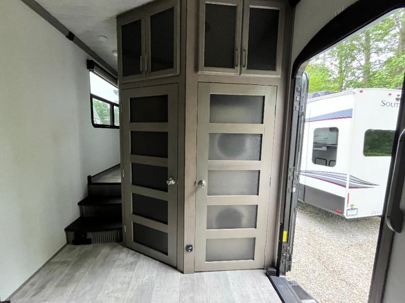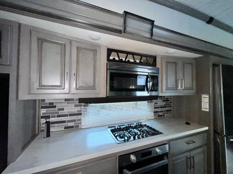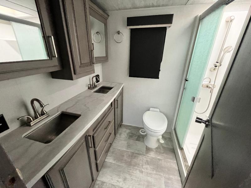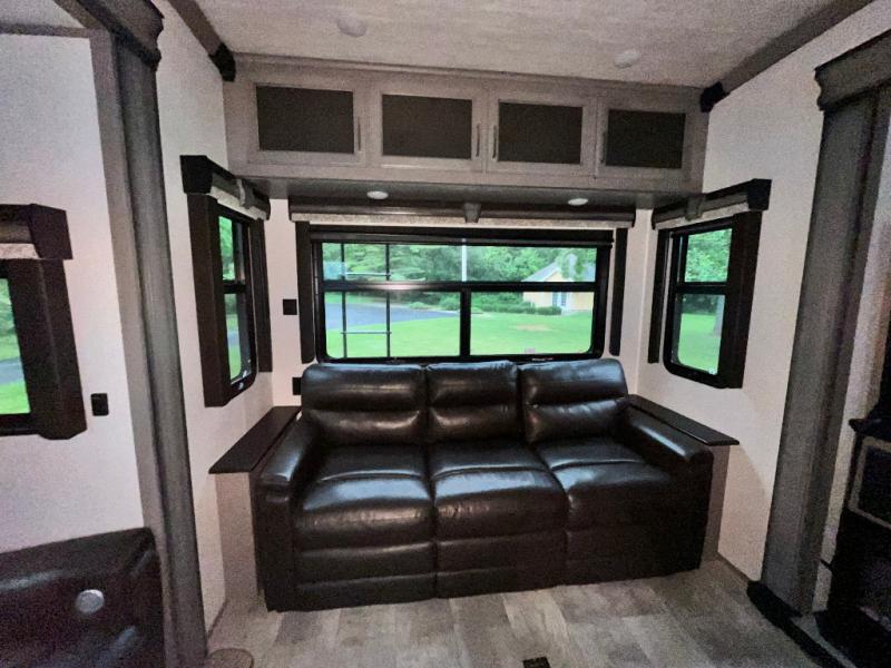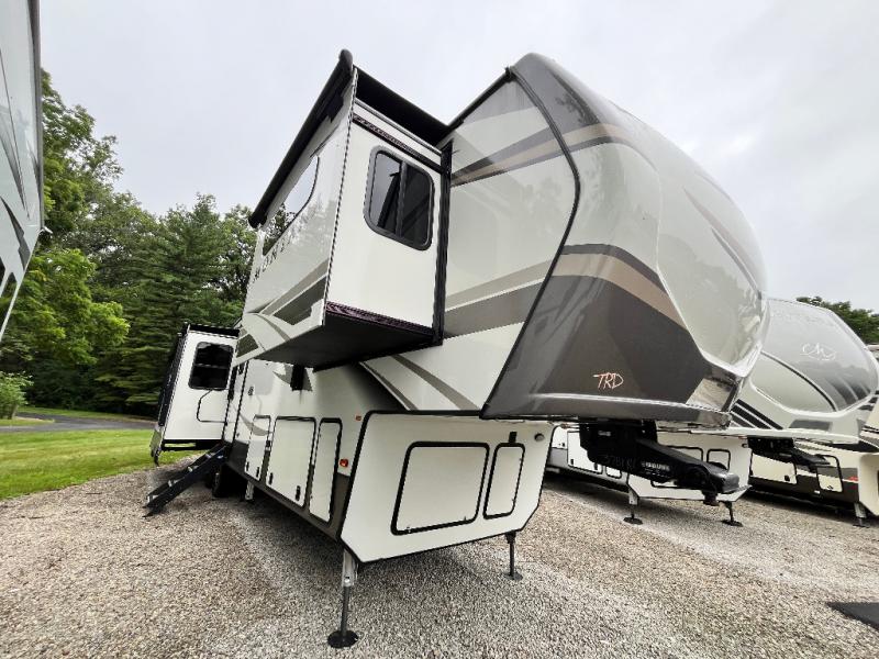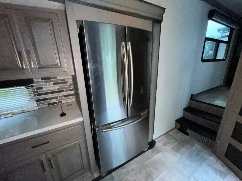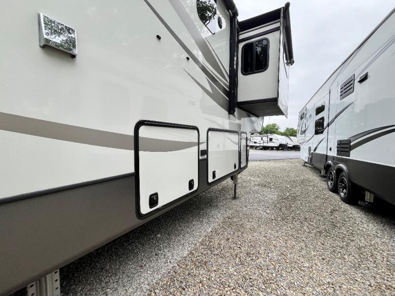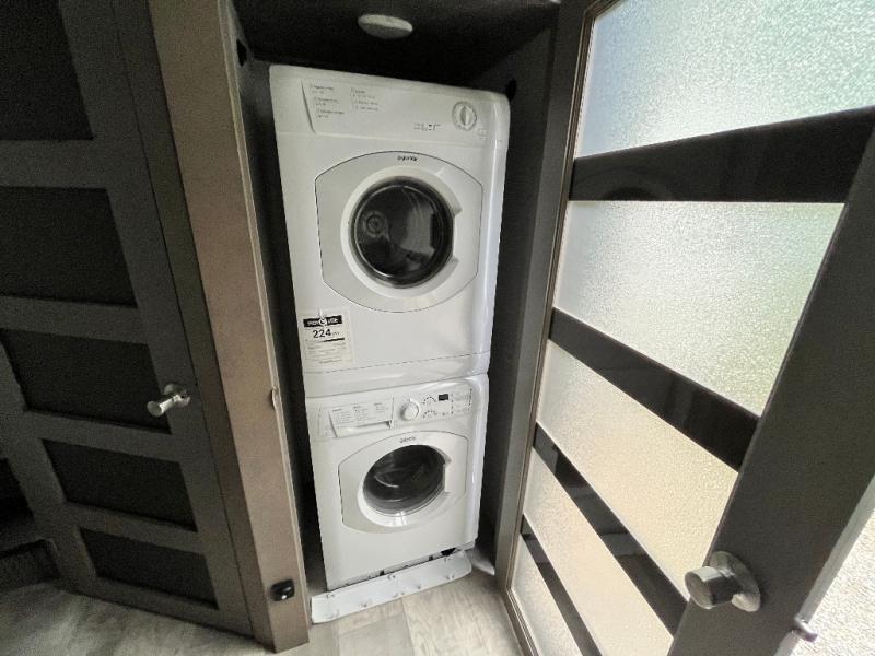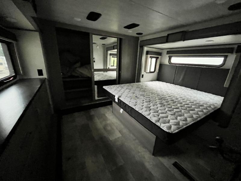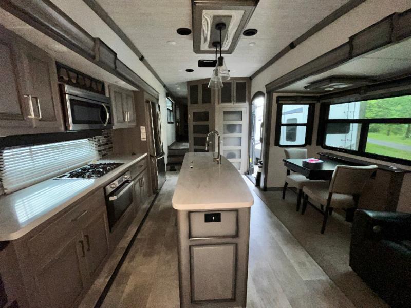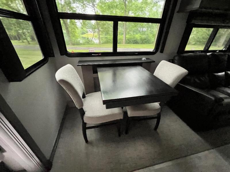 The chef is going to love the kitchen layout with a center island, dual slides in this area offering lots of prep space, a convection microwave, an 18 cu. ft. residential refrigerator, and a large pantry. You will find a handy entry closet nearby that you can add a washer/dryer option if you like to keep everything clean while away from home. The rear living area offers a hide-a-bed sofa giving you more sleeping space for guests, and the theatre seats with power recliners might be your favorite spot. If you aren't outside under one of the two awnings, you can work or dine at the free standing dinette. The master bedroom offers a slide out queen bed or choose a king bed option, a barn door for style, and a large closet, plus more storage. And the full bathroom gives you two sinks to get ready quicker for what ever is next.