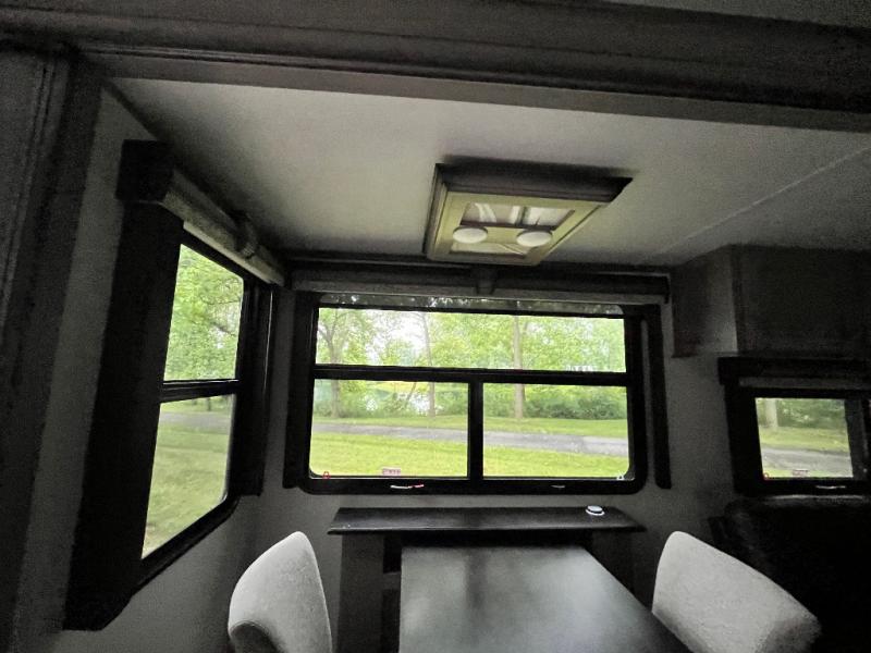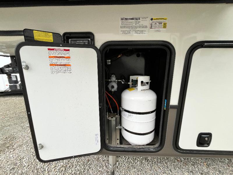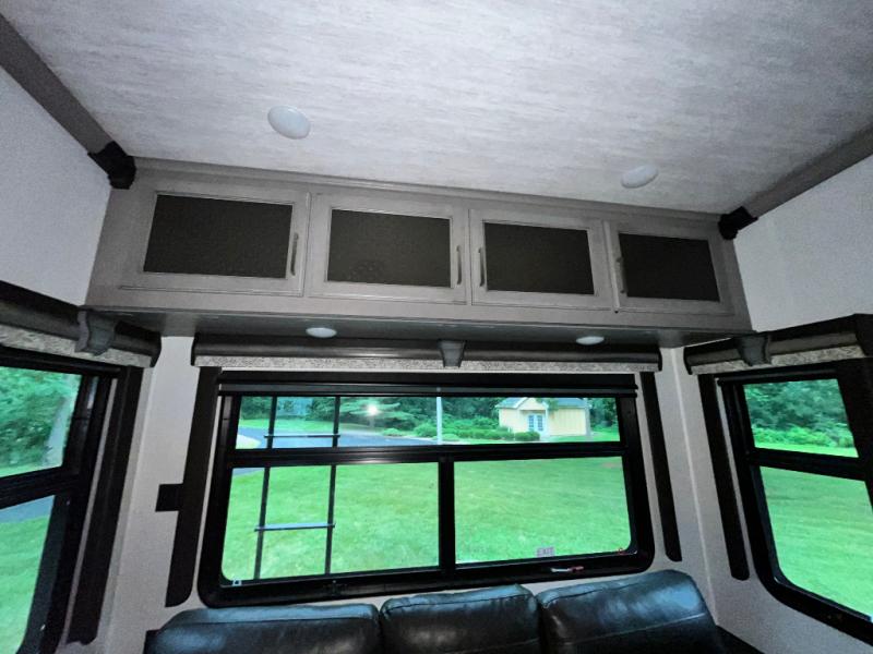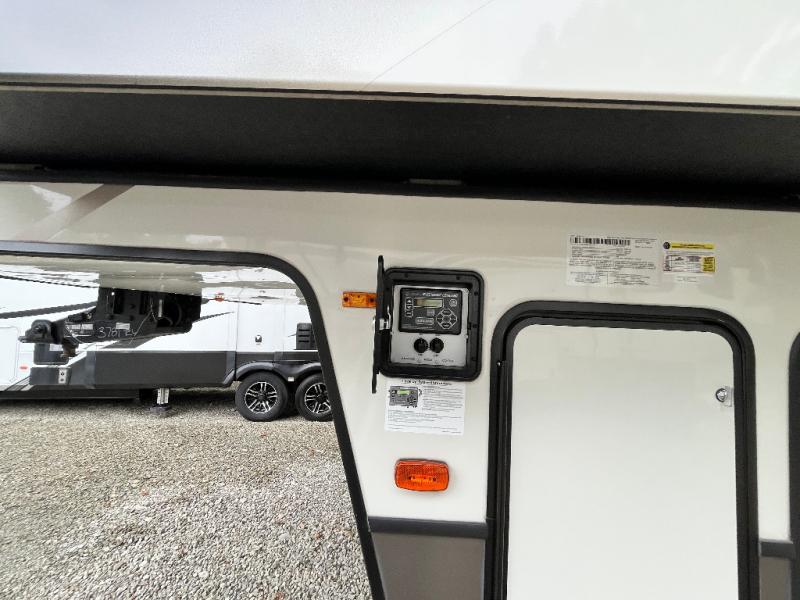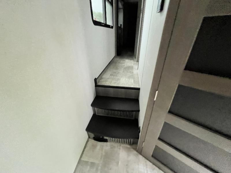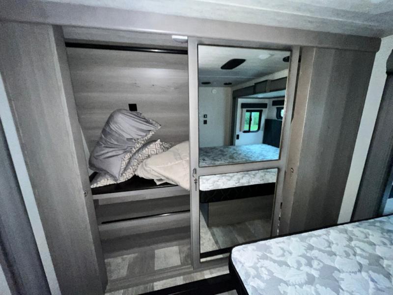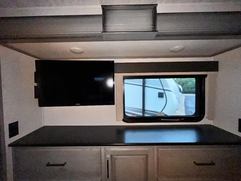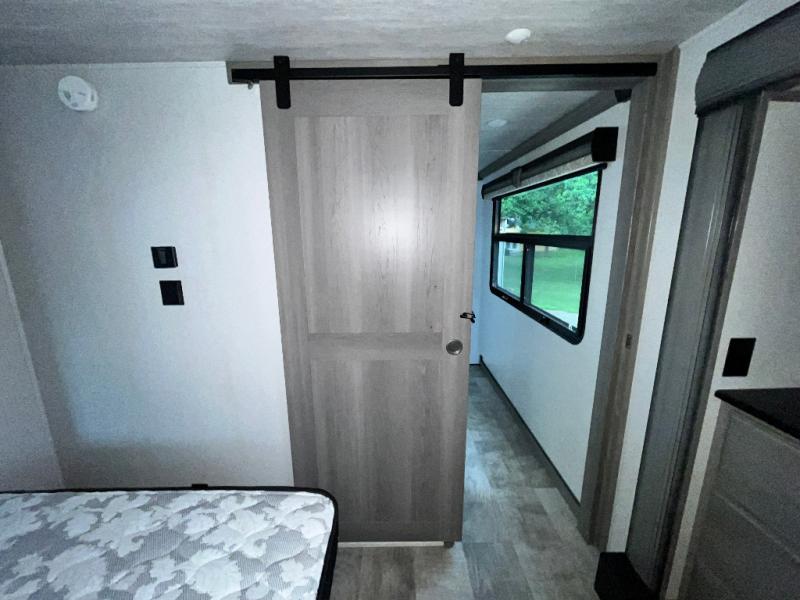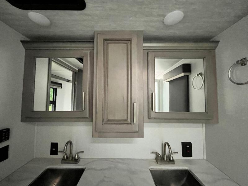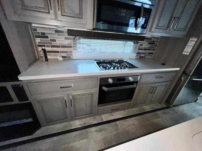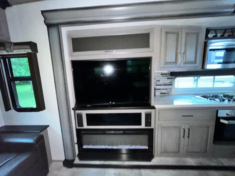 The chef is going to love the kitchen layout with a center island, dual slides in this area offering lots of prep space, a convection microwave, an 18 cu. ft. residential refrigerator, and a large pantry. You will find a handy entry closet nearby that you can add a washer/dryer option if you like to keep everything clean while away from home. The rear living area offers a hide-a-bed sofa giving you more sleeping space for guests, and the theatre seats with power recliners might be your favorite spot. If you aren't outside under one of the two awnings, you can work or dine at the free standing dinette. The master bedroom offers a slide out queen bed or choose a king bed option, a barn door for style, and a large closet, plus more storage. And the full bathroom gives you two sinks to get ready quicker for what ever is next.