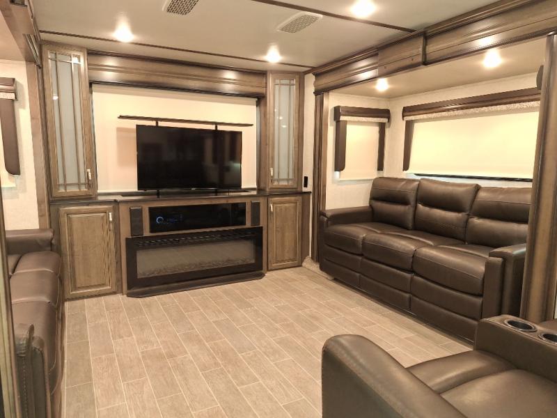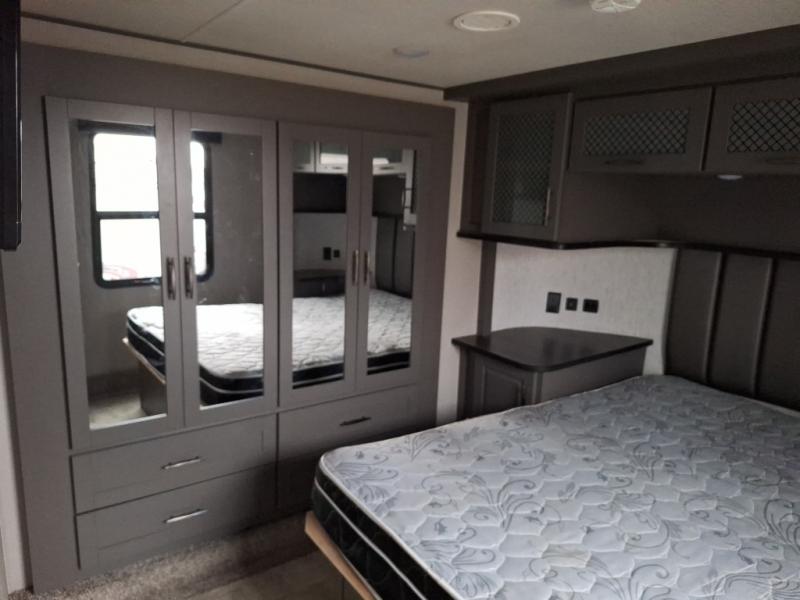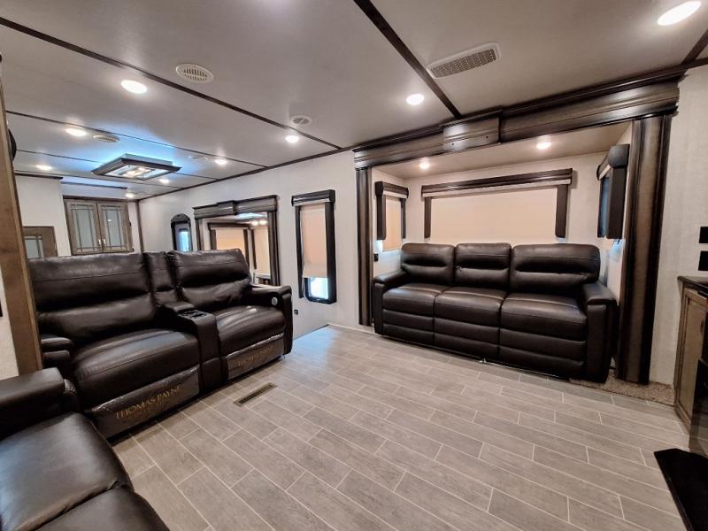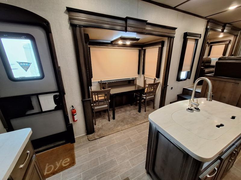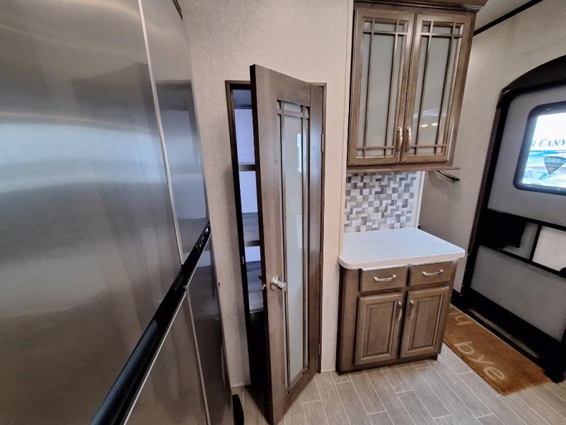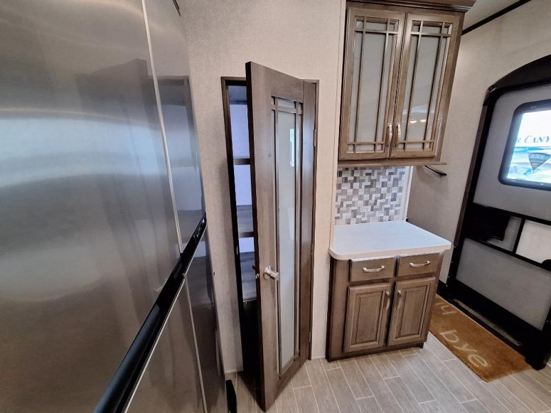 If you want your own space to cook, your own area to watch TV, and your own private bedroom, take a look at this Montana. The rear living and entertaining room includes dual hide-a-bed sofas and theatre seats with power recliners making a cozy place to gather around to talk about your day while staying warm. The kitchen offers a separate space to make and eat meals including a coffee station for the coffee lover in the family. You will also find a center island, an 18 cu. ft. RV refrigerator, a convection microwave, and a pantry allowing you to make any meal while away from home. The barn door into the front bedroom gives you more space, plus the bedroom includes plenty of storage and a place to add a washer and dryer option.