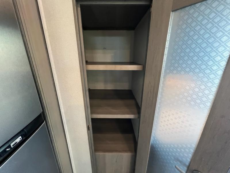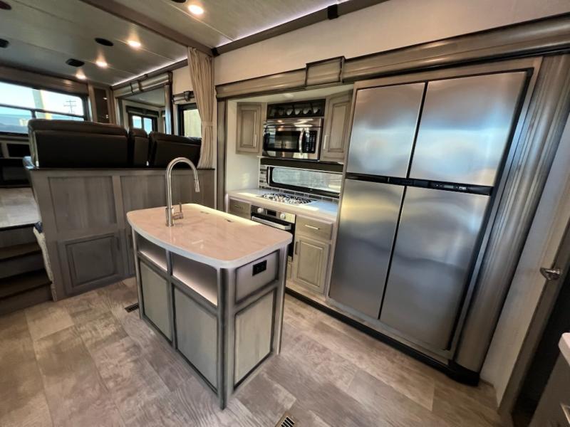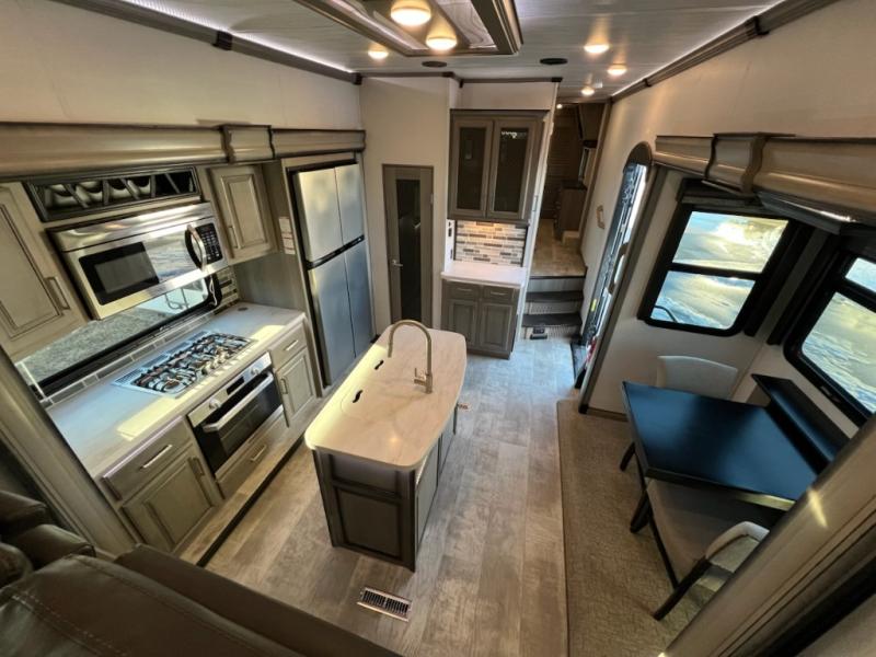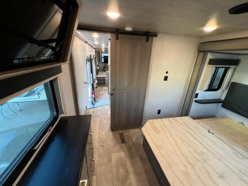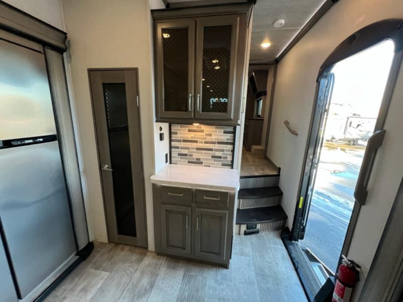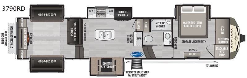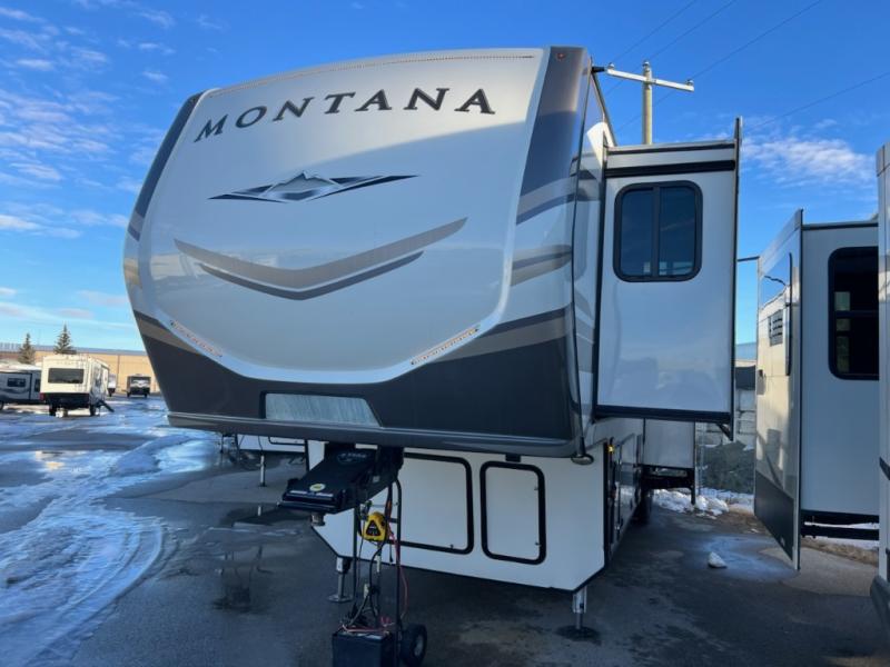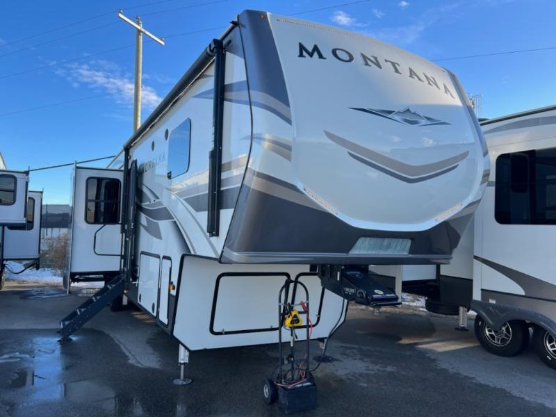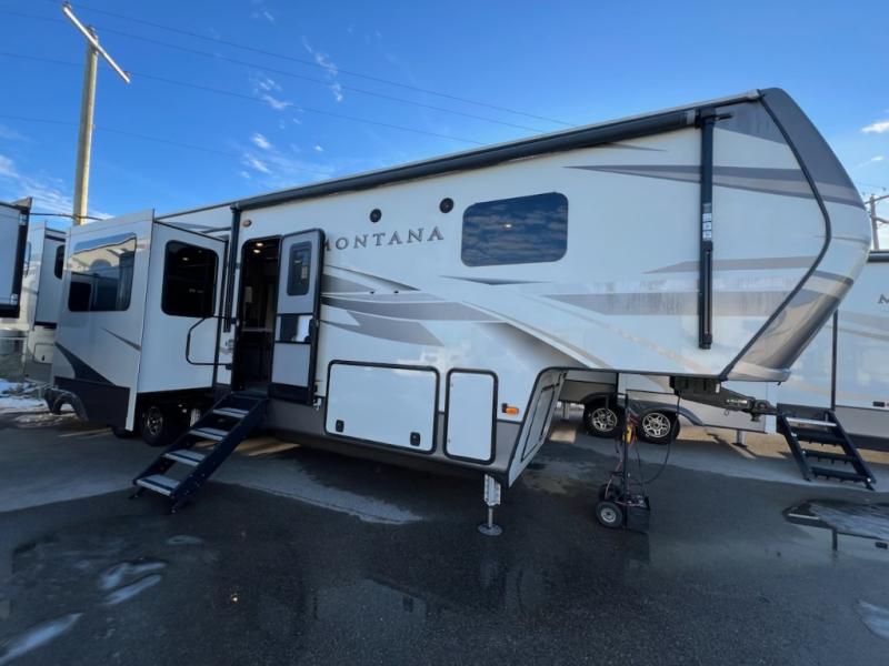 If you want your own space to cook, your own area to watch TV, and your own private bedroom, take a look at this Montana. The rear living and entertaining room includes dual hide-a-bed sofas and theatre seats with power recliners making a cozy place to gather around to talk about your day while staying warm. The kitchen offers a separate space to make and eat meals including a coffee station for the coffee lover in the family. You will also find a center island, an 18 cu. ft. RV refrigerator, a convection microwave, and a pantry allowing you to make any meal while away from home. The barn door into the front bedroom gives you more space, plus the bedroom includes plenty of storage and a place to add a washer and dryer option.