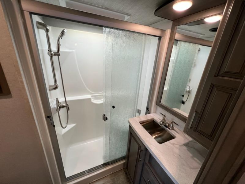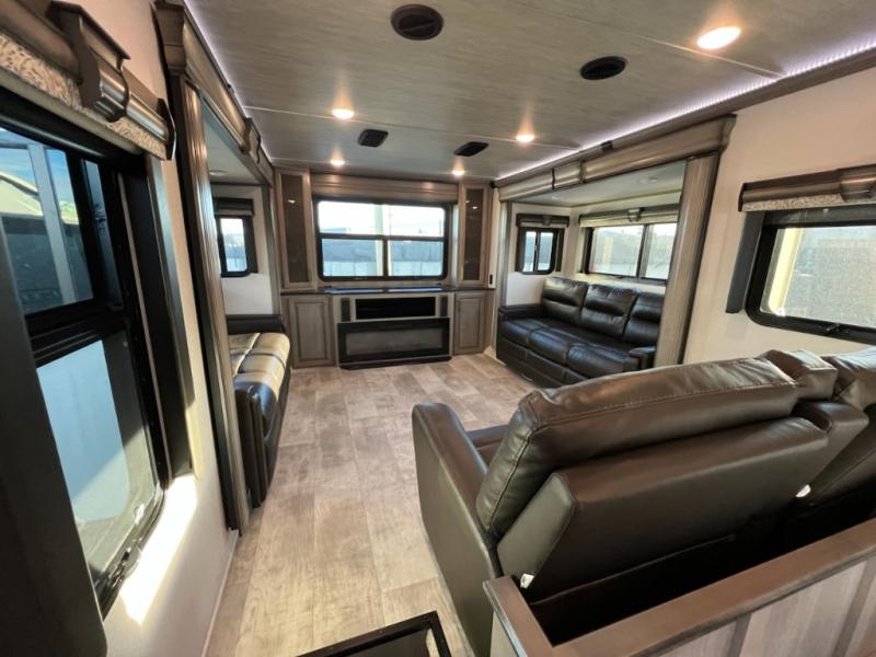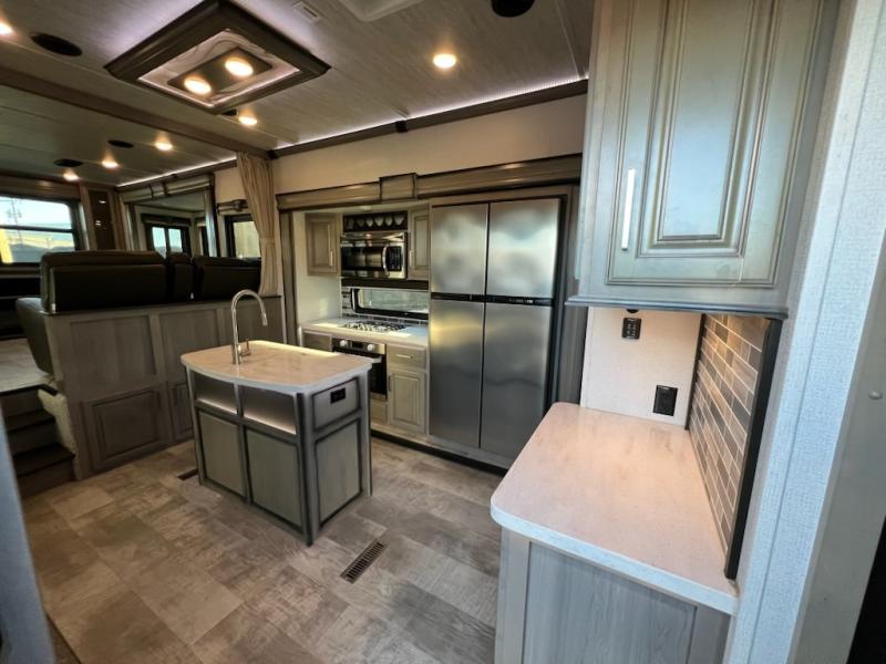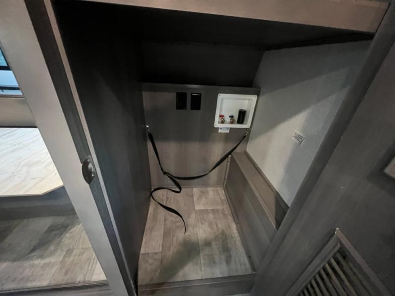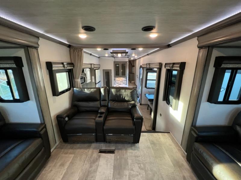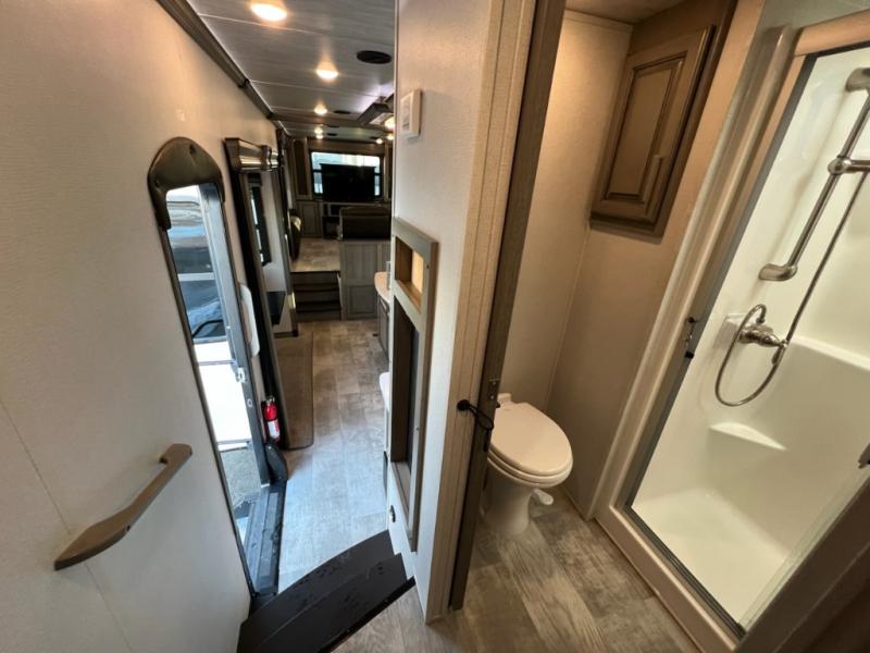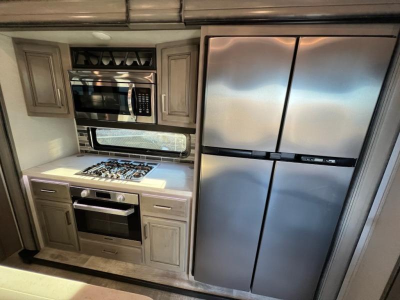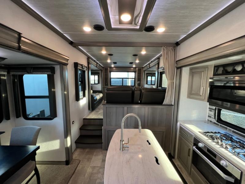 If you want your own space to cook, your own area to watch TV, and your own private bedroom, take a look at this Montana. The rear living and entertaining room includes dual hide-a-bed sofas and theatre seats with power recliners making a cozy place to gather around to talk about your day while staying warm. The kitchen offers a separate space to make and eat meals including a coffee station for the coffee lover in the family. You will also find a center island, an 18 cu. ft. RV refrigerator, a convection microwave, and a pantry allowing you to make any meal while away from home. The barn door into the front bedroom gives you more space, plus the bedroom includes plenty of storage and a place to add a washer and dryer option.