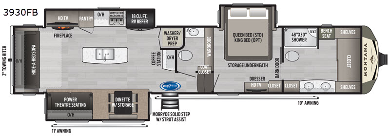 It's time to start living your traveling dreams in this Montana! Beginning with the master suite featuring a dual sink vanity to the front luxurious bathroom with a shower with a seat and plenty of closet space along the front wall including shelves, and a bench seat offering you a space to put on your shoes. You will also find the half bath comes in handy when other campers visit. The main living space includes the kitchen amenities such as a coffee station, a closet prepped for a washer and dryer if you choose to add that option, and all the appliances necessary to live full-time in the fifth wheel. You can probably imagine relaxing at night in your own theatre seat with power recliner or having a snack at the free standing dinette with movable chairs before you retire for the evening.
