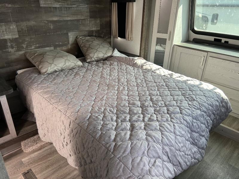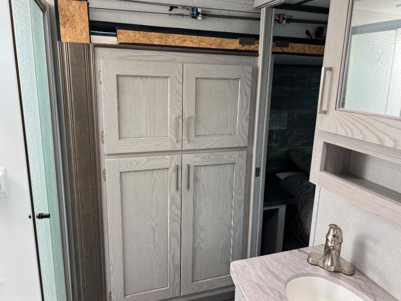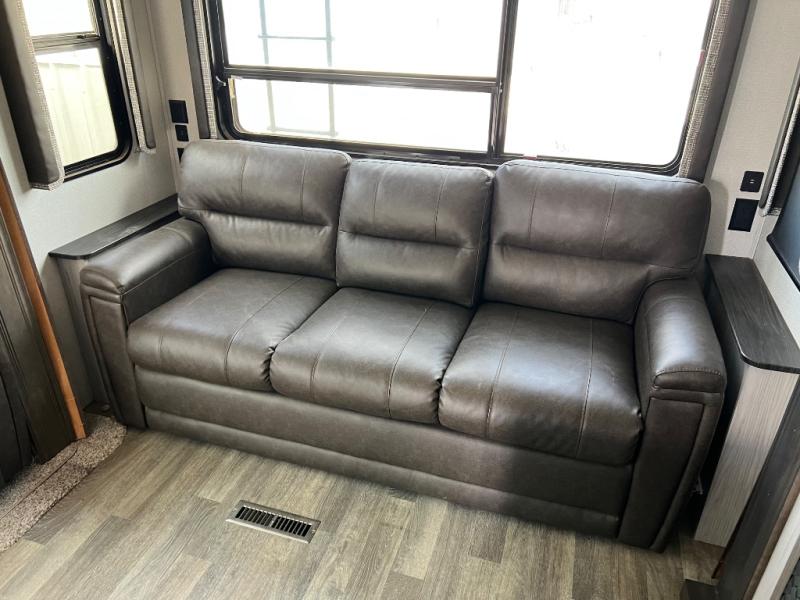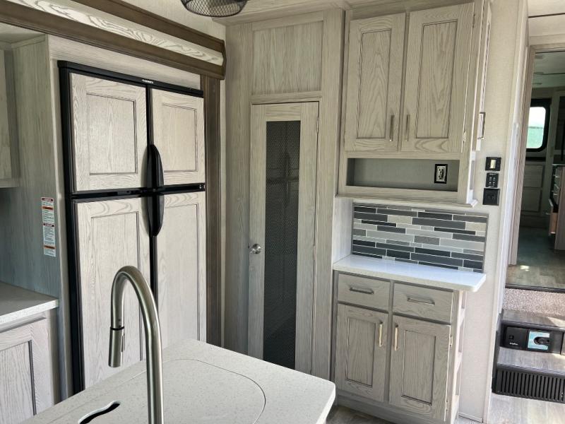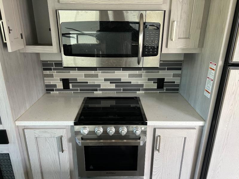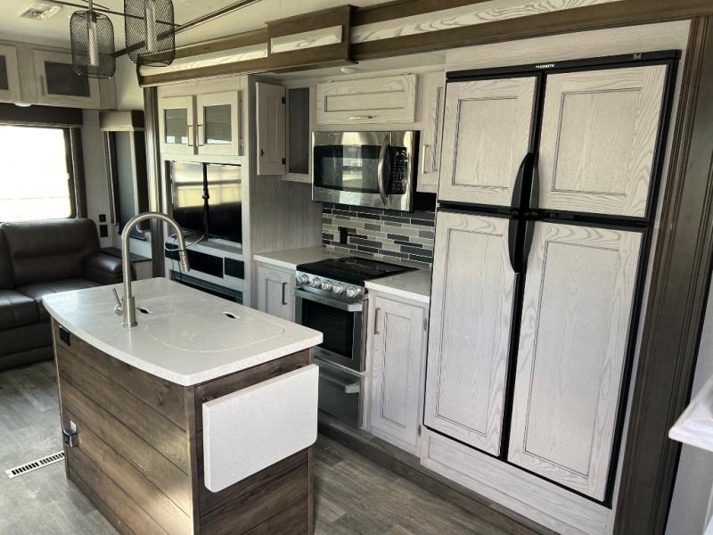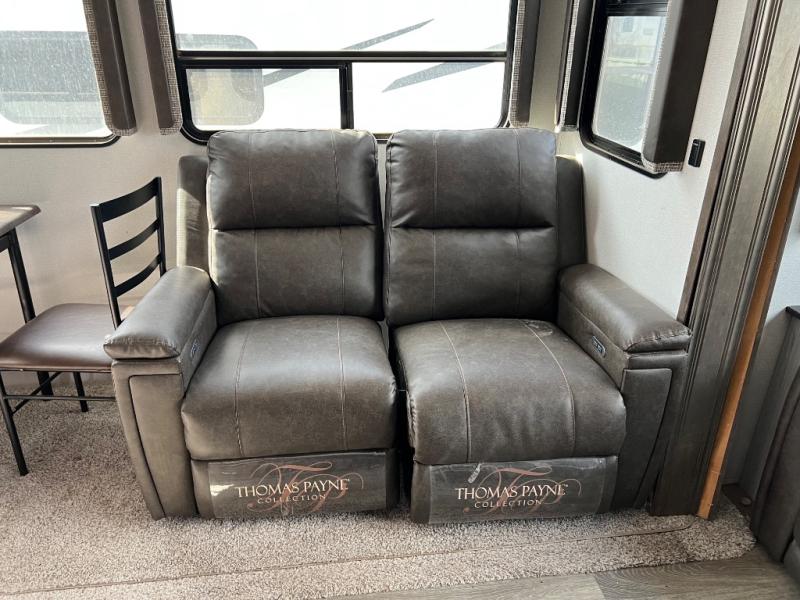 When you're ready to camp in style and in luxury, choose this fifth wheel that can comfortably sleep six people, making it the perfect family unit. Mom and dad will love their own private bedroom with a slide out queen bed and entry into the dual entry bath. The chef of the family will have everything they need to prepare dinner after a long hike; a residential microwave, a three burner range with a glass top, an 18 cu.ft. residential refrigerator, and a pantry to store all the dry goods. In the evening, the rear living area will be an inviting area with its power theater seating, and an HDTV with a fireplace below.