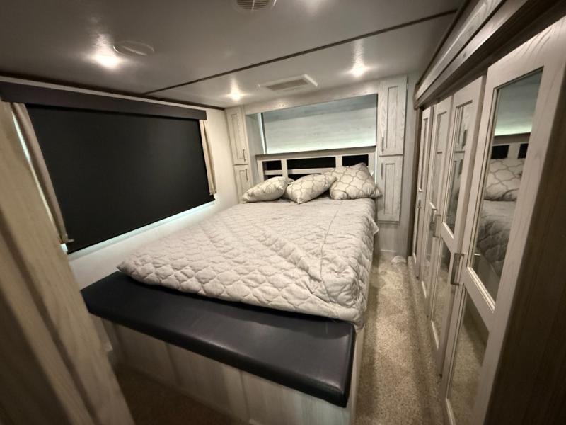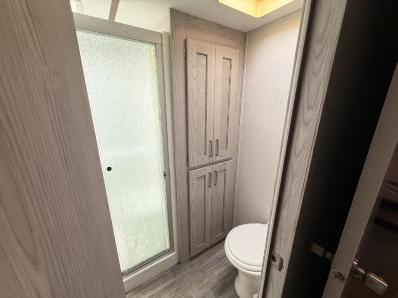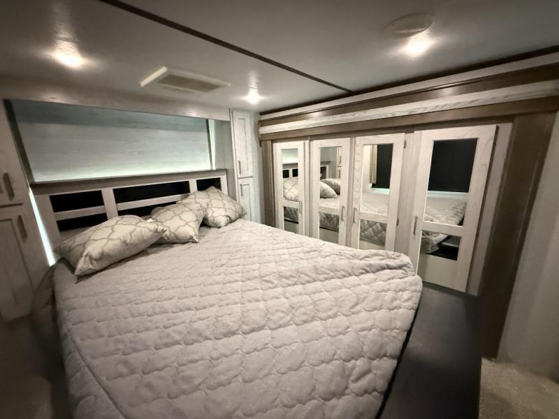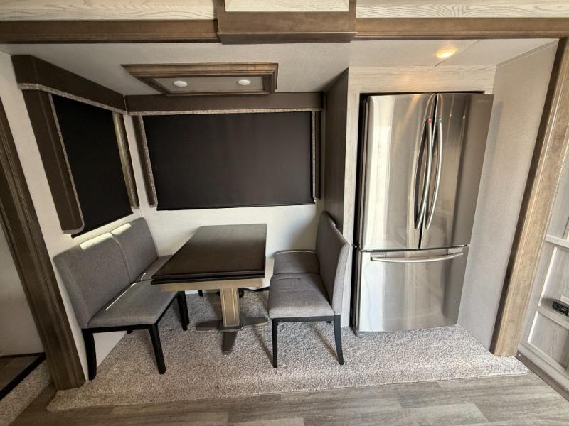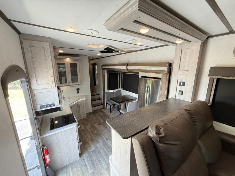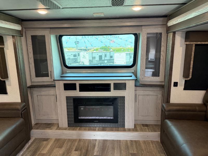 Have you been envisioning your golf cart going with you to your favorite destination? Have you been searching for the perfect fifth wheel? This Montana High Country toy hauler fifth wheel might just be the perfect answer! Model 380TH allows you to camp comfortably, and has space to take along your favorite ride on toy! Below the rear bedroom you will find a unique garage with a motion sensor LED light and a ramp door for easy loading and unloading. The front living area includes a telescoping HD LED TV above an LED fireplace, plenty of seating choices, and a front patent-pending windshield design providing amazing views. The cook will enjoy making meals in the kitchen which also includes a hutch and a 18 cu. ft. residential refrigerator. The bedroom features a queen bed, an HD LED TV, and a large slide out wardrobe. Choose this fun RV today!