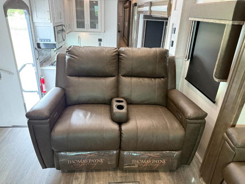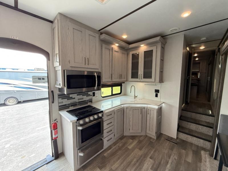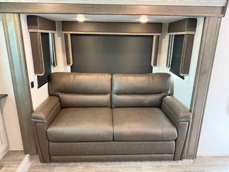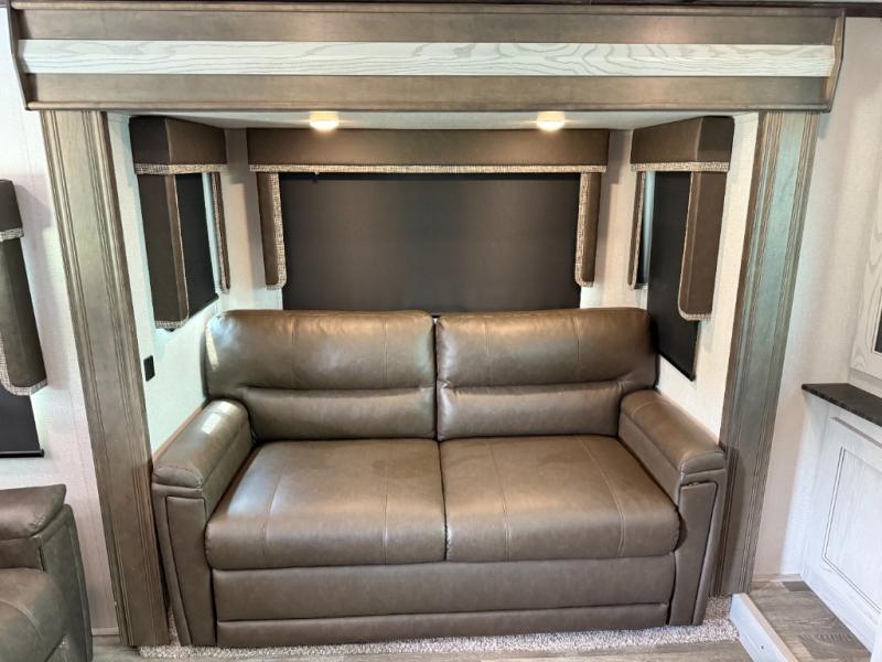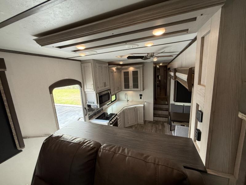 When heading out and setting up in a Keystone Montana High Country fifth wheel you will appreciate the Dexter E-Z Lube axles, Max Turn front cap and radius frame with Hitch Vision, and an enormous drop frame pass-through storage compartment to name a few features. Inside you will find luxury and comfort with the 78" tall main slide outs and flush mounted LED interior lights. The bath features a skylight over the shower, seamless countertops, and a vanity with three drawers for extra storage space!. The chef of the family is going to love the Montana High Country's kitchen with its Furrion 21" two in one stainless steel cooktop and oven, a 30" over-the-range microwave, solid surface countertops, and a high-rise faucet with an integrated pull-out sprayer, plus so much more!