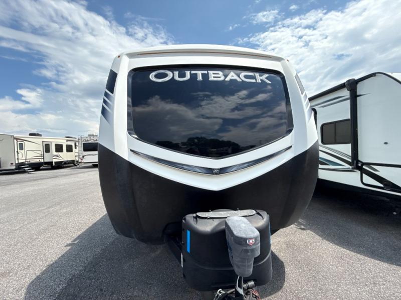 You will be amazed by the many different accommodations that this Outback travel trailer has to offer! The rear kitchen is filled with exceptional features, like the pull-out trash can, wine rack, and hutch, and every morning you will look forward to beginning your day with a customized hot beverage created at the coffee center. The private bedroom will not only be your favorite place to relax each evening, but it will also be your pet's favorite lounge area because of the built-in kennel that has been included just for them.