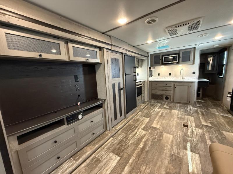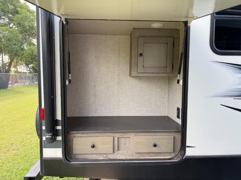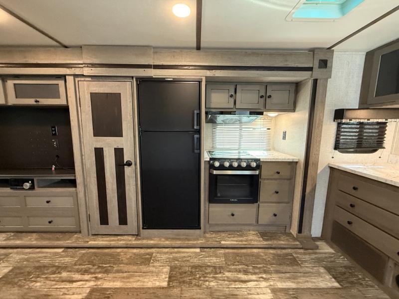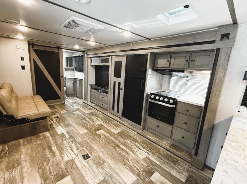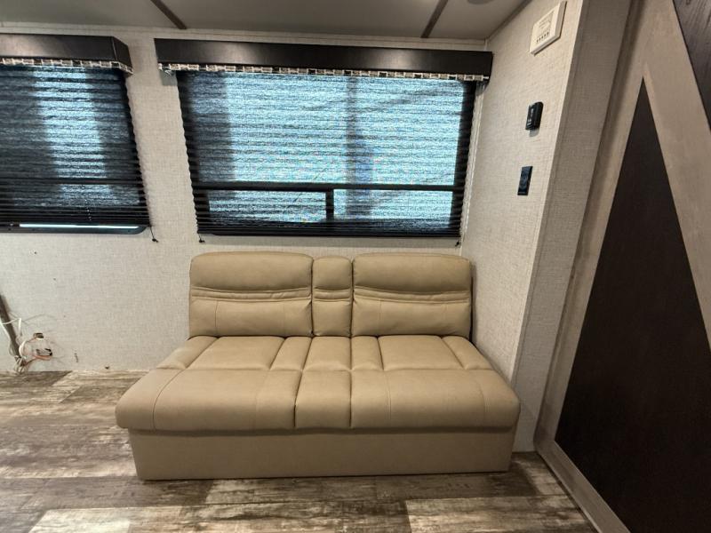 This Outback Ultra Lite travel trailer is perfect for couples who enjoy getting away to the great outdoors. You will be the envy of every campground because of all of the exceptional amenities that come included in this trailer, like the full rear bath with a sliding barn door, the built-in pet kennel underneath the queen-size bed in the private bedroom, and the pull-out trash can in the kitchen. You will also enjoy relaxing together each night on the sofa sleeper or choose the optional theater seating in its place, as you watch a show on the 50" TV.