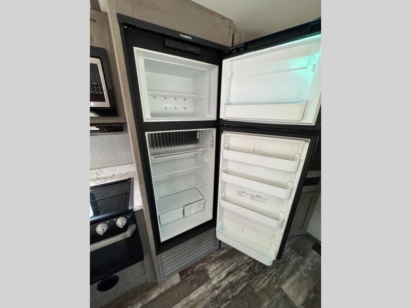 Set your sights on this travel trailer that can comfortably sleep eight to nine people thanks to the double-size bunks in the private bunkhouse! After a long day in the hot sun, clean up in the walk-through bath then get dinner cooking on the three burner range or heat up leftovers in the microwave. You will find extra seating on the sofa sleeper or on the booth dinette. Outside you can relax under the 21' awning as you enjoy the outdoor entertainment. There is even an outside refrigerator for cold drinks!