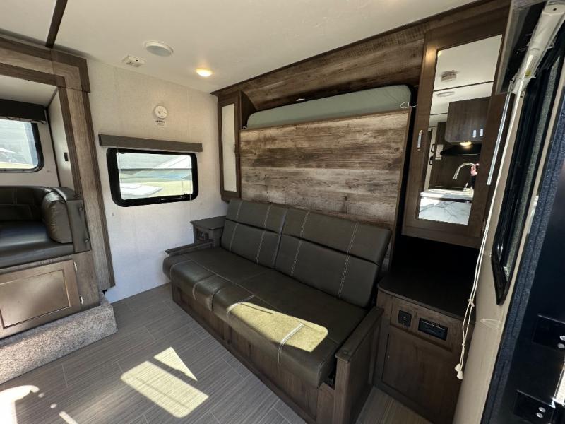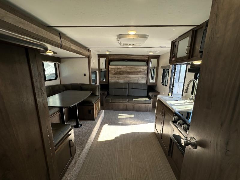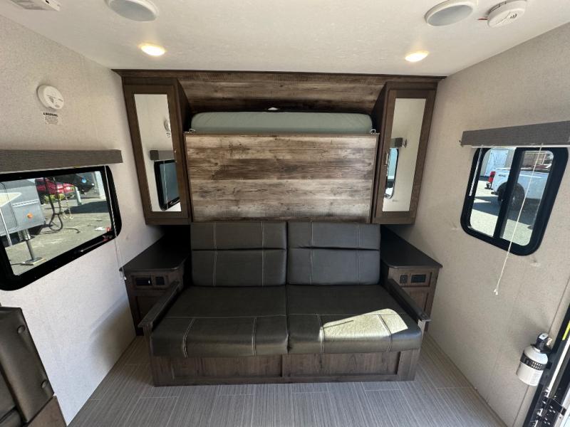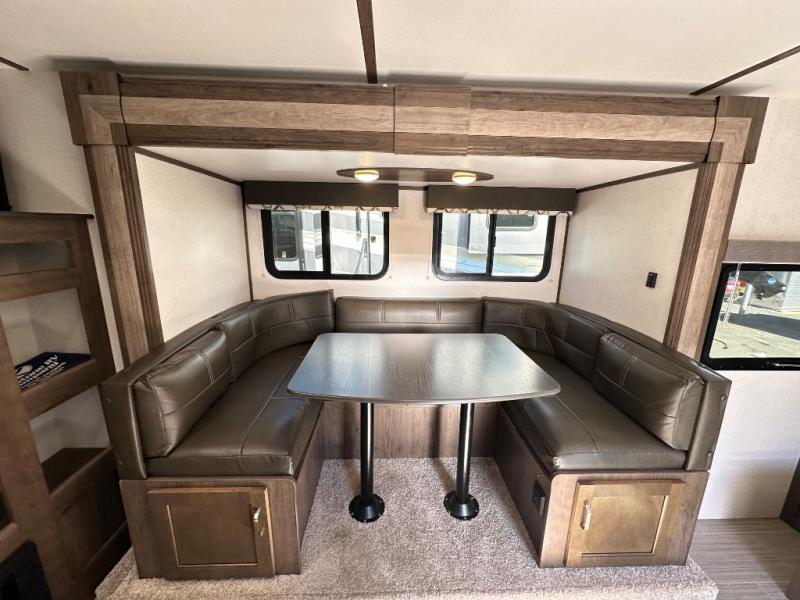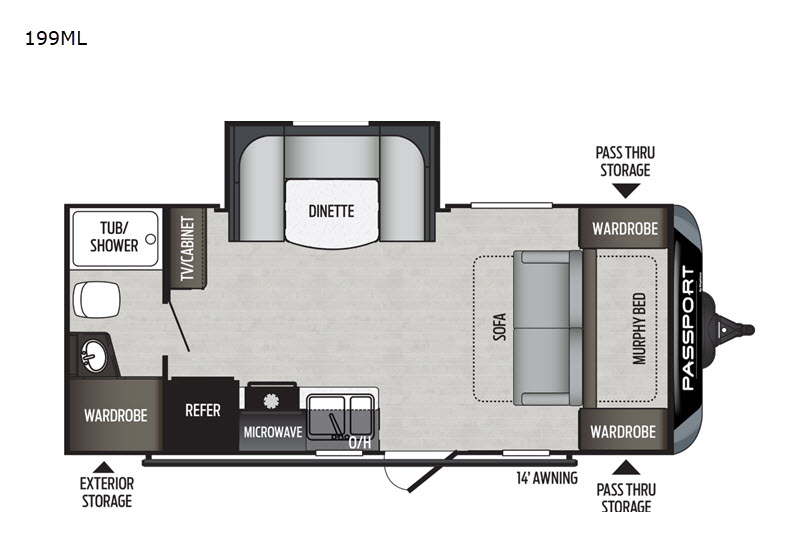 Envision relaxing on the sofa while the family plays a board game at the U-shaped dinette slide in this Passport travel trailer. You can enjoy the front living area during the daytime, and at night this space can transform into a sleeping area once the Murphy bed has been folded down. The full rear bathroom allows you to skip the public facilities, and it also has a large wardrobe so that you can store items like your towels and toiletries. The full kitchen provides the necessary appliances to make your favorite meals, like a three-burner range, a gas oven, and a microwave, and you will also find plenty of storage for all your things with interior storage, as well as in the exterior pass-through storage compartment.