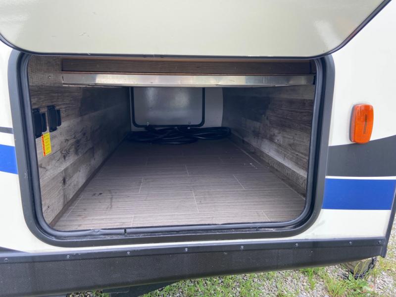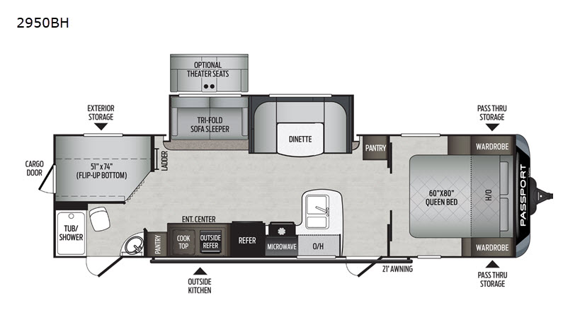 Can you envision your kids playing outside around the campsite while you cook meals at the outdoor kitchen on this Passport travel trailer? Your spouse will probably be sitting in a camp chair relaxing under the adjustable electric awning. This trailer will be perfect for your cooking preference, your spouse's relaxing idea, and your kids' sleeping arrangements. When it's time for bedtime, you can retire to your own master bedroom up front via the main entrance, and the kids can head to their own bunk beds in the rear through the exterior bathroom entrance. The bottom flip-up bunk allows you to store extra items when traveling down the road.