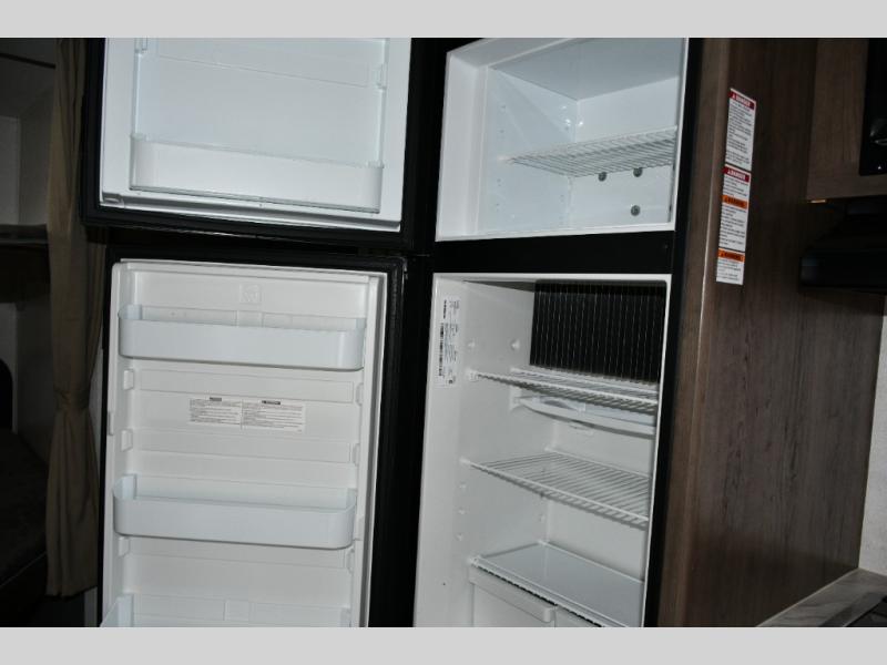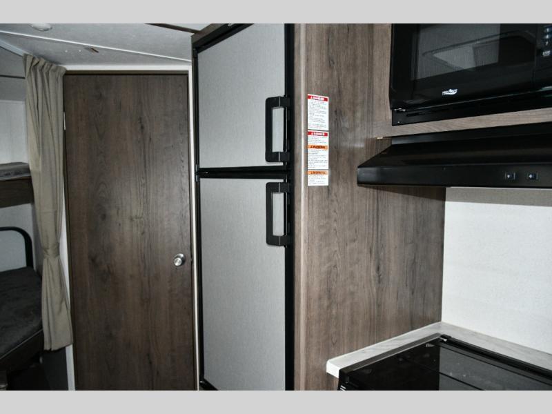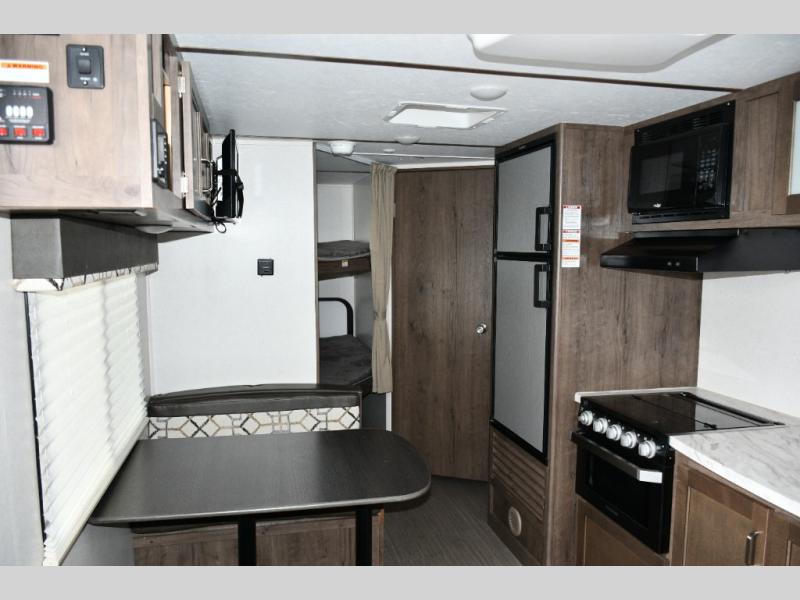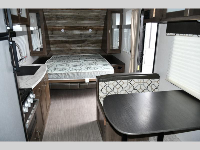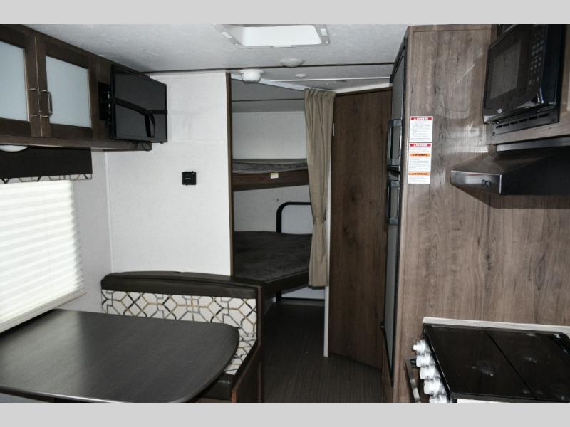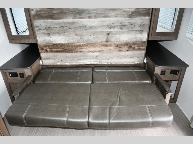 From the moment you arrive at camp, this Passport makes it easy to relax and enjoy the outdoors. The front Murphy bed converts effortlessly from a comfortable sofa during the day into a cozy sleeping space at night, giving you flexible living and lounging options. In the rear, double-size bunk beds provide plenty of room for kids, guests, or extra gear.
