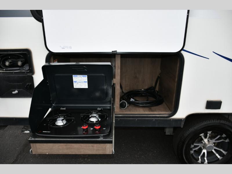The full bathroom ensures everyone stays comfortable on longer trips, while the rear cargo door adds versatility for hauling bikes, outdoor gear, or bulky camping essentials. When mealtime rolls around, the outside kitchen lets you cook in the fresh air while staying connected to the action around the campsite.