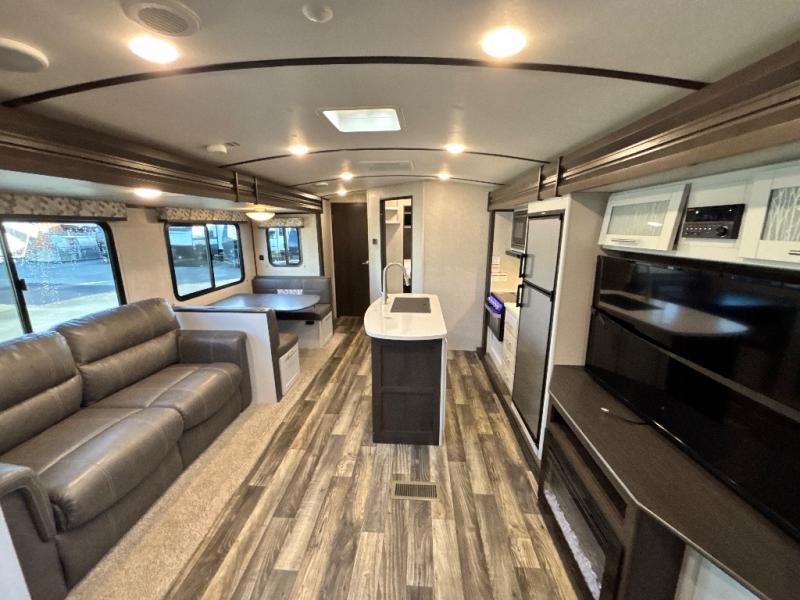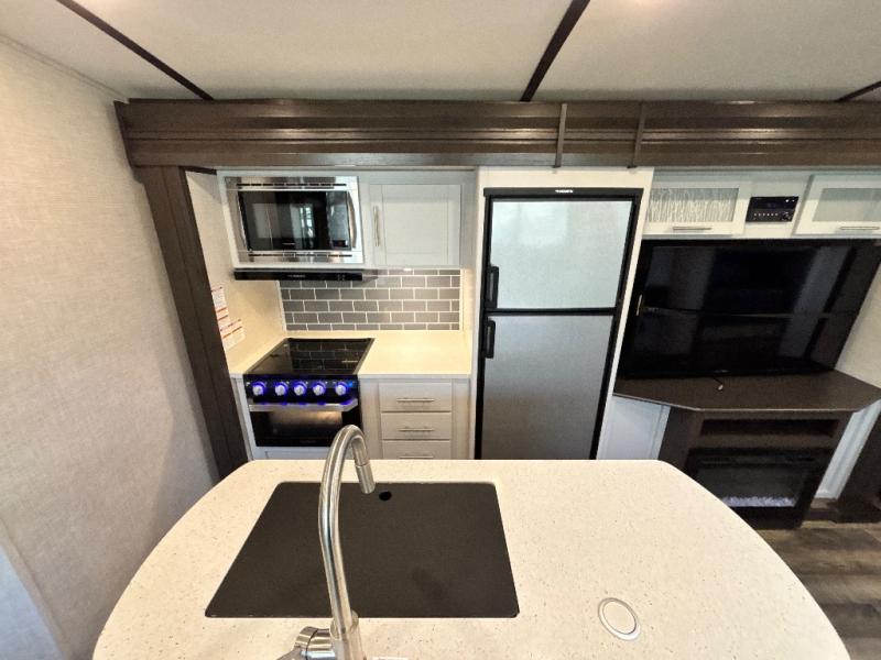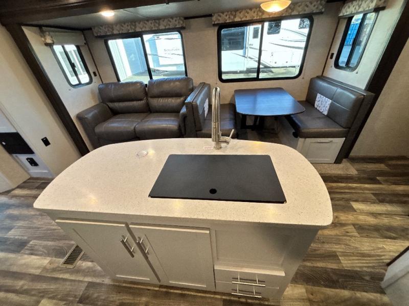 If you want a travel trailer that is both functional and elegant, then you need this Premier Ultra Lite. Every inch of this trailer is kept open and spacious because of the three slides that have been added, and because this unit has both a private bunkhouse with a sofa and a private bedroom, it is the perfect choice for those who enjoy traveling with guests. Everyone will love getting together in the spacious living area in the evenings to take in the delicious aromas coming from the kitchen which includes an island and all the appliances needed to make a holiday meal. And you can store a few extra drinks in the outside refrigerator.