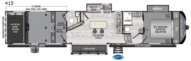 With its queen-size bed, four-seat recliner, loft with twin bed, dual opposing sofas, and electric bunk, this Raptor toy hauler gives you plenty of accommodations to sleep eight people comfortably each night. And everyone in your group will appreciate having a full and half bathroom available. The kitchen will be your family's favorite place to enjoy an afternoon snack with the flip-up bar stools at the kitchen island, and you will be able to reheat last night's leftovers quickly with the convection microwave. You might even like to add a washer/dryer option in the garage if you plan to stay awhile.