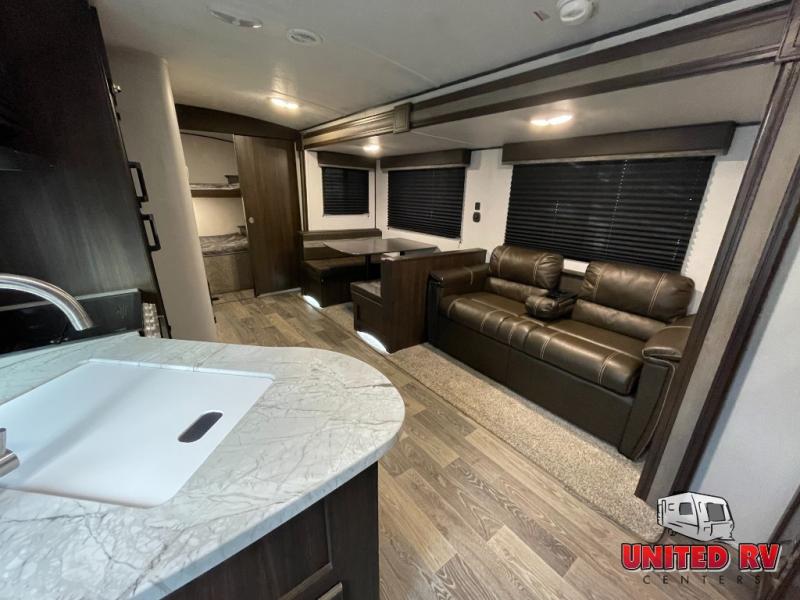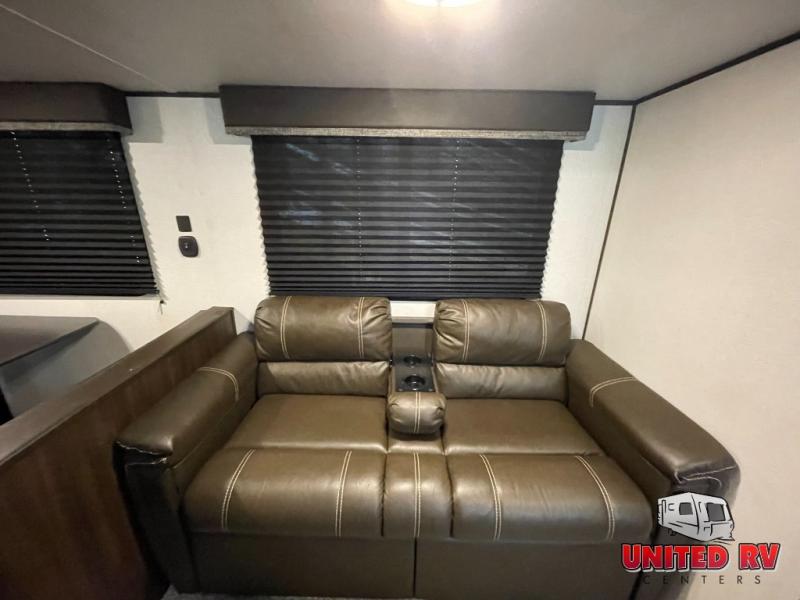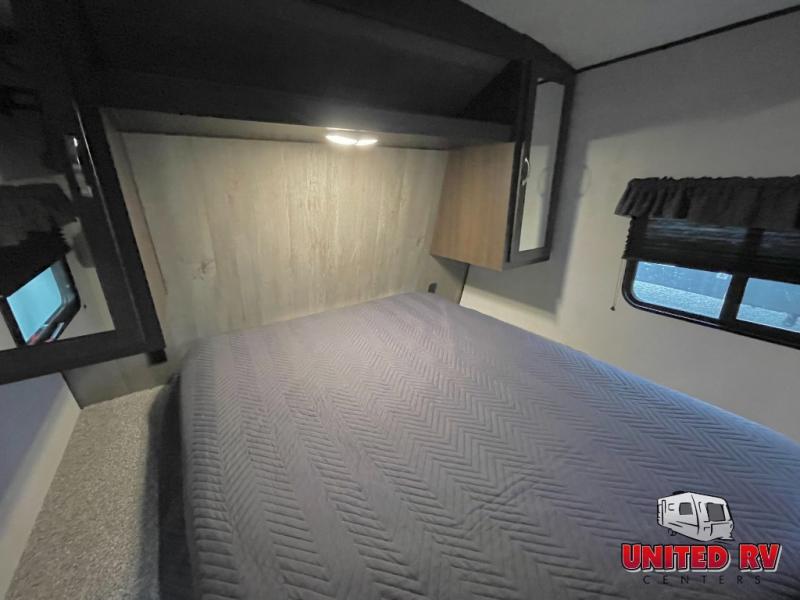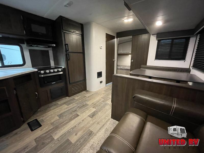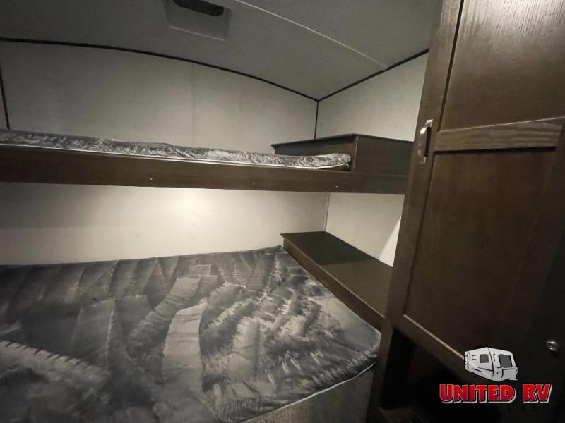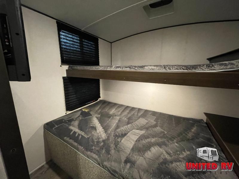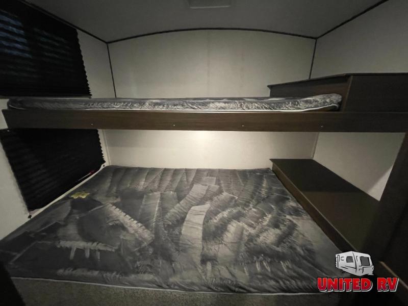 This Keystone Springdale travel trailer offers you plenty of comfortable living space, plus the rear garage door allows you to bring along some fun outdoor gear. Step inside this model and be pleasantly surprised by all of the amenities. You will find a spacious combined kitchen and living area with a large slide, booth dinette, and sofa opposite the door. Each seating area can also double as sleeping space if needed at night. Overhead storage is conveniently located for all of your daily dishes and things. The very rear of this model features a private bunkhouse which contains a set of 48" x 74" bunks with a wardrobe, as well as a toy box for your things.