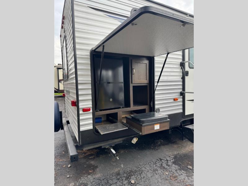 Lots of space, a bunkhouse for the kids, an outdoor kitchen for the chef in the family, two entry doors, and so much more makes this Keystone Springdale travel trailer perfect for a larger family to enjoy. The perfect feature for those who enjoy cooking and dining outside is an outdoor kitchen. The rearmost entrance makes accessing the bath easy from the outside, and the private bunkhouse features a flip-up bunk above a Fun Lounger, as well as another bunk above an entertainment center on the opposite side. There is plenty of overhead storage for all of your dishes and things. In the private front bedroom, you can enjoy a bit of seclusion from the rest of the unit and get a great night's sleep.
