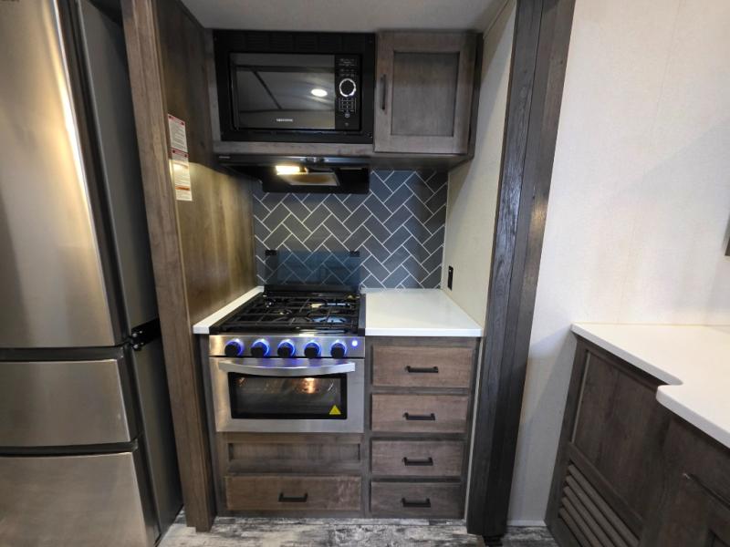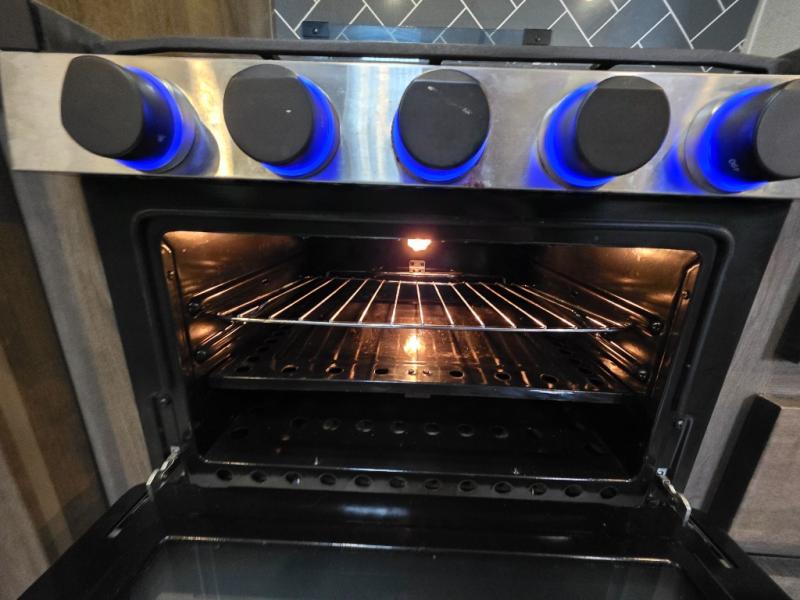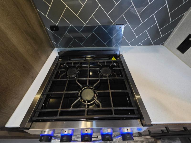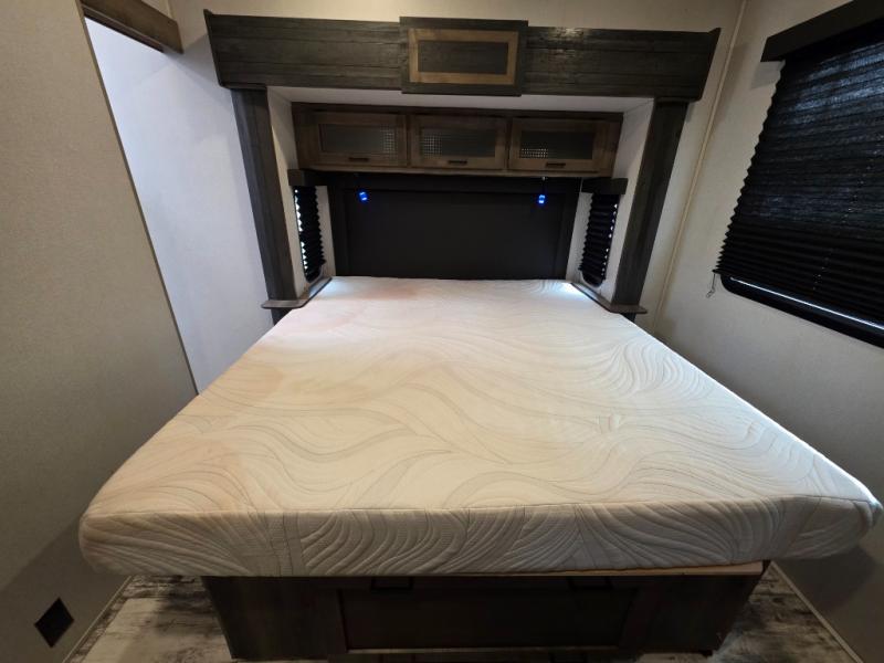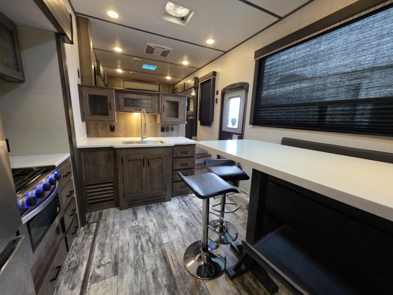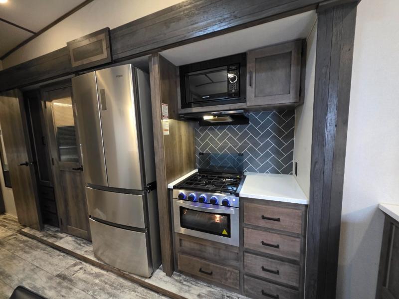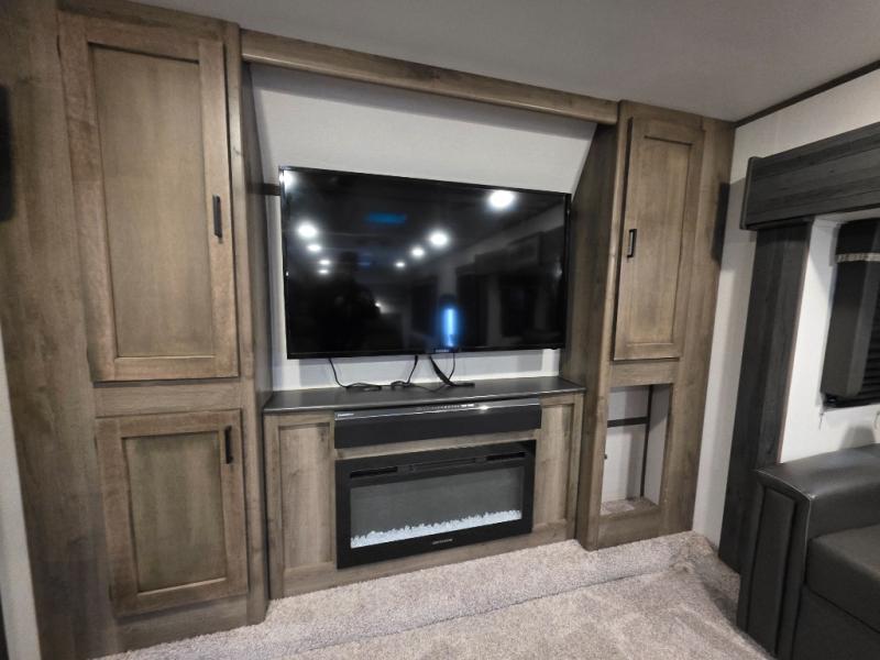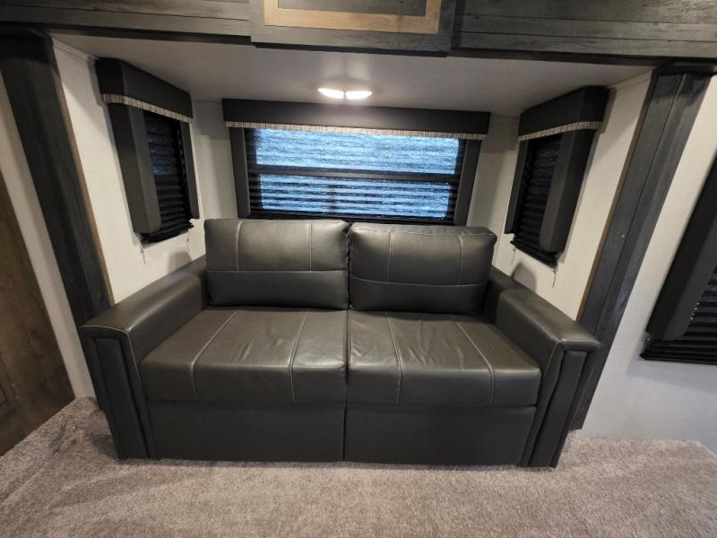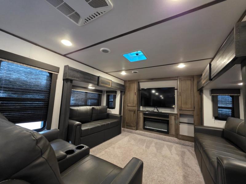 Your whole gang is going to love camping in this fifth wheel! The front living area is perfect for everyone to relax and socialize together between the two tri-fold sofas that can transform into queen-sized beds and the full reclining theater seating with cupholders directly across from the 50" TV with a fireplace below it. After you have whipped up your best meal with the three burner range, you can head to the dinette with three chairs on one side and a booth on the other side, and your clean up will be even easier with the XL stainless steel sink and faucet. The dual entry bath makes it easy for everyone to access especially the lucky couple who gets to sleep in the rear private bedroom!