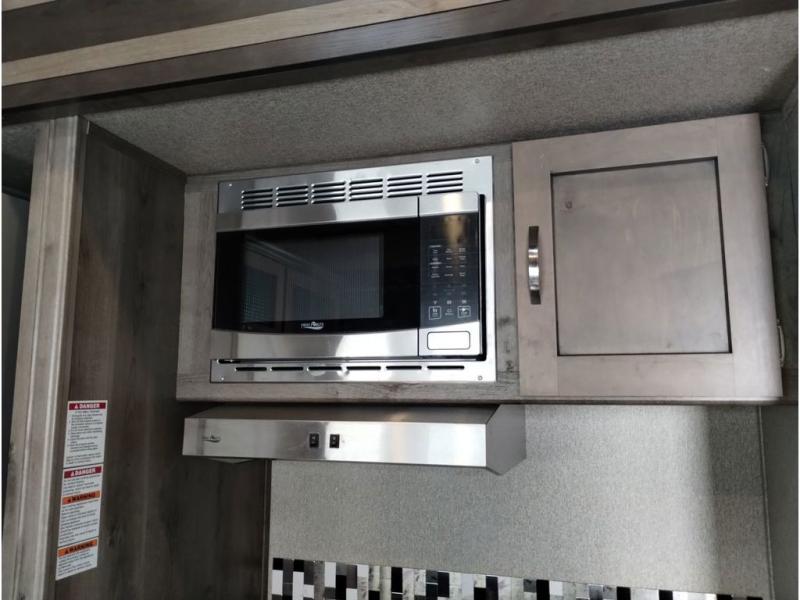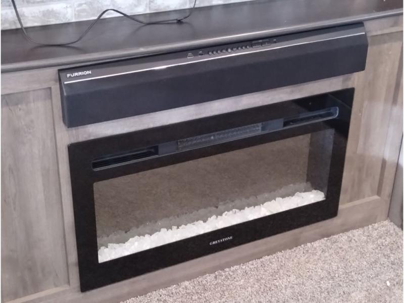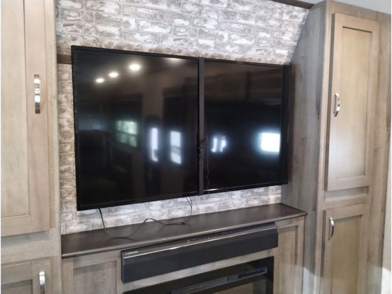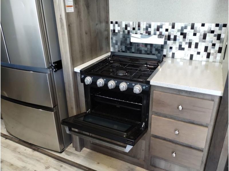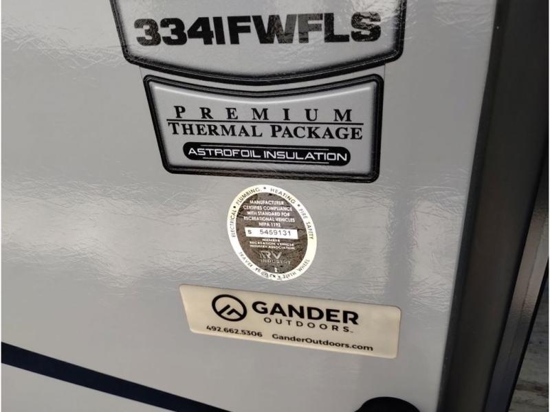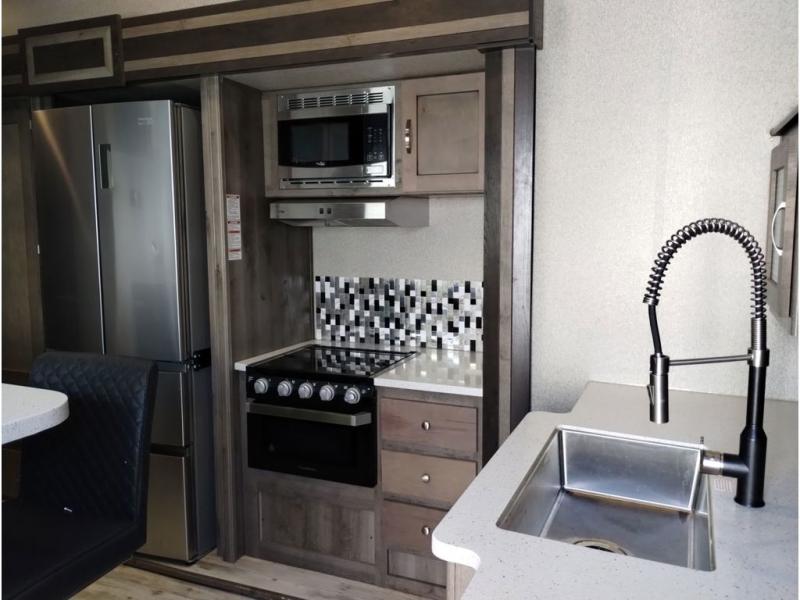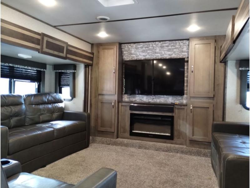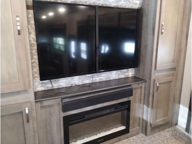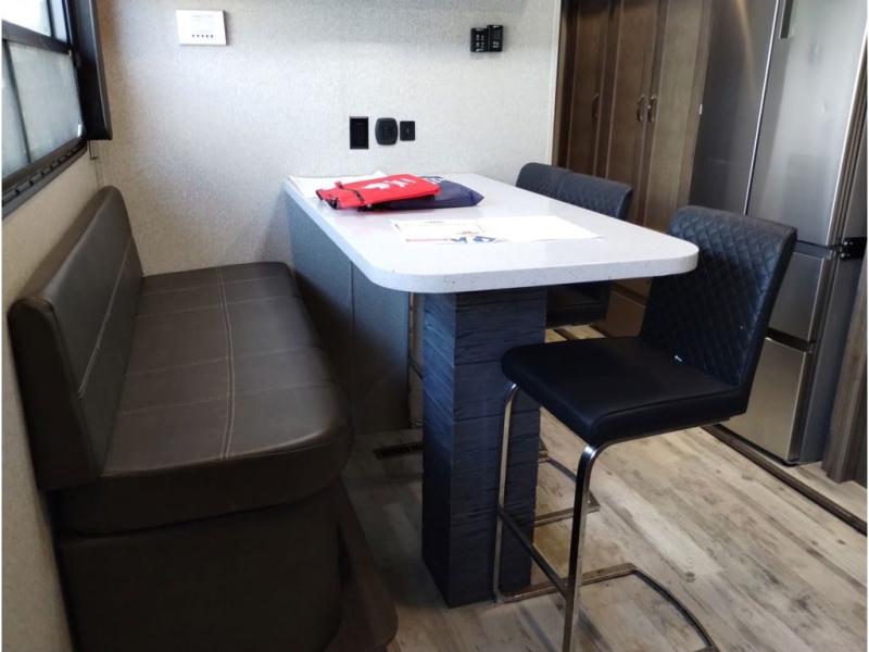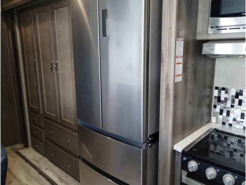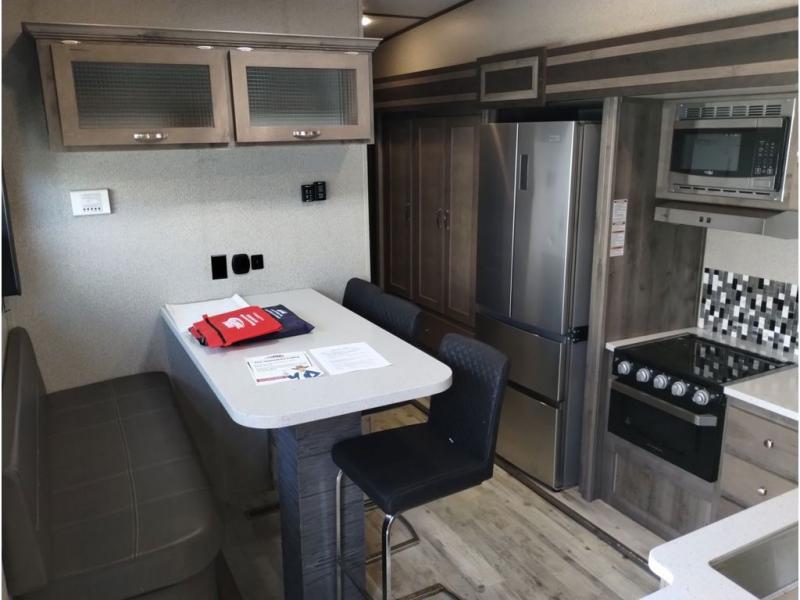 This 3341FWFLS fifth wheel is the same as model 3340FWFLS except that it features a 16 cu. ft. stainless steel residential refrigerator and has a smaller pantry, but one that is still big enough to hold all of your favorite snacks! The front living area is perfect for everyone to relax and socialize together between the two tri-fold sofas that can transform into queen-sized beds and the full reclining theater seating with cupholders directly across from the 50" TV with a fireplace below it. After you have whipped up your best meal with the 3-burner range, you can head to the dinette with three chairs on one side and a booth on the other side, and your clean up will be even easier with the stainless steel XL sink and faucet. The dual entry bath makes it easy for everyone to access especially the lucky couple who gets to sleep in the rear private bedroom!