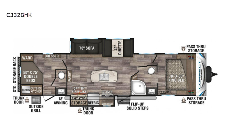 Get connected with your best adventures in this Connect travel trailer! This unit is the perfect choice for those who want to bring along friends or family because the rear bunkhouse suite will keep your guests feeling comfortable with their very own half bath and exterior entrance while you sleep like a baby on your own king-size bed in the front master suite. You can host a summer barbecue for everyone with the outdoor kitchen and 18' electric awning with LED lights, or you can have everyone gather inside to watch the big game on the LED TV while you sit back on the 70" sofa and 42" booth dinette.