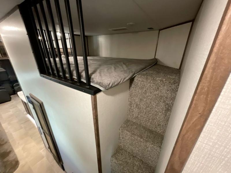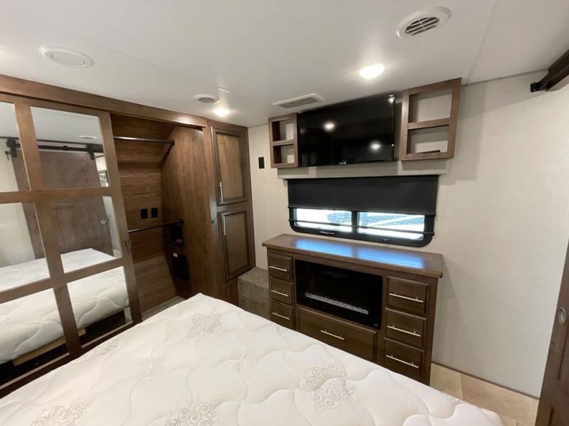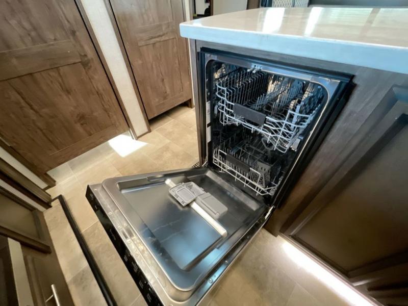 This Durango Gold fifth wheel is one you don't want to pass up. After you've arrived at your destination, set up the rear patio deck and fold out the camp chairs. Stretch your legs around the campsite then head back to prepare lunch in the convection microwave. You'll also find a three burner cooktop, a 22" oven, and an 18 cu.ft. refrigerator will hold food for the whole week. This model features plenty of conveniences, like the stainless steel dishwasher and the kitchen island for more counter space. Mom and dad will find the front private bedroom open and inviting with its king bed slide out, a 32" LED TV, and plenty of closet space and the kids will love the middle private bedroom that includes a queen-sized loft above and a hide-a-bed sofa. There is even a desk top here that can be used for telecommuting or the kids' coloring table.