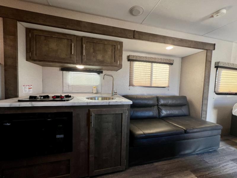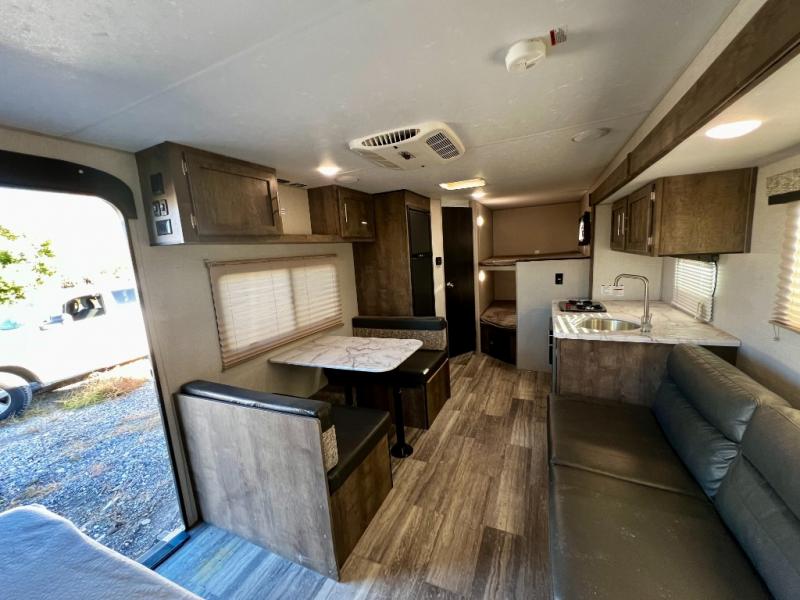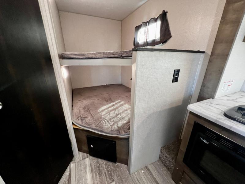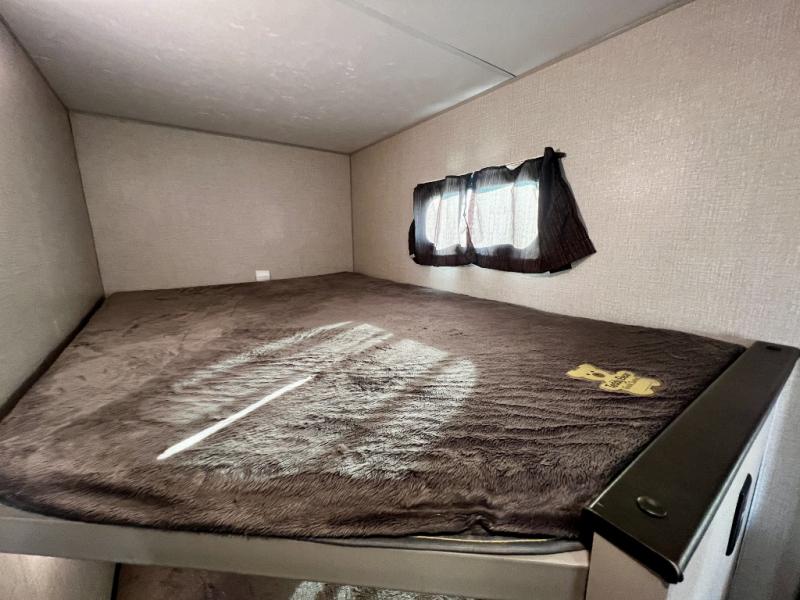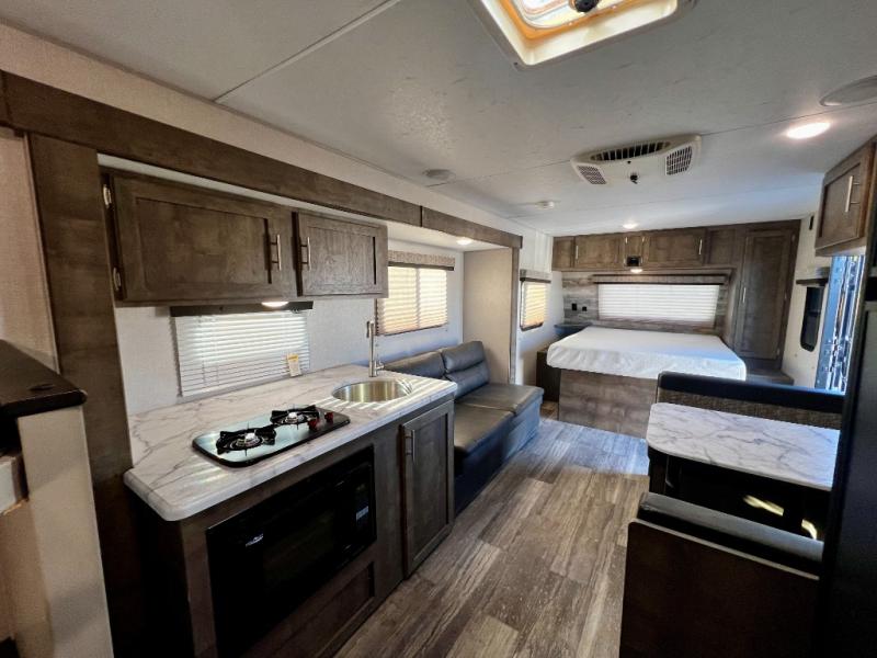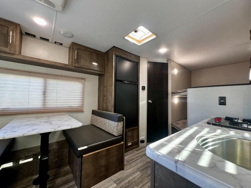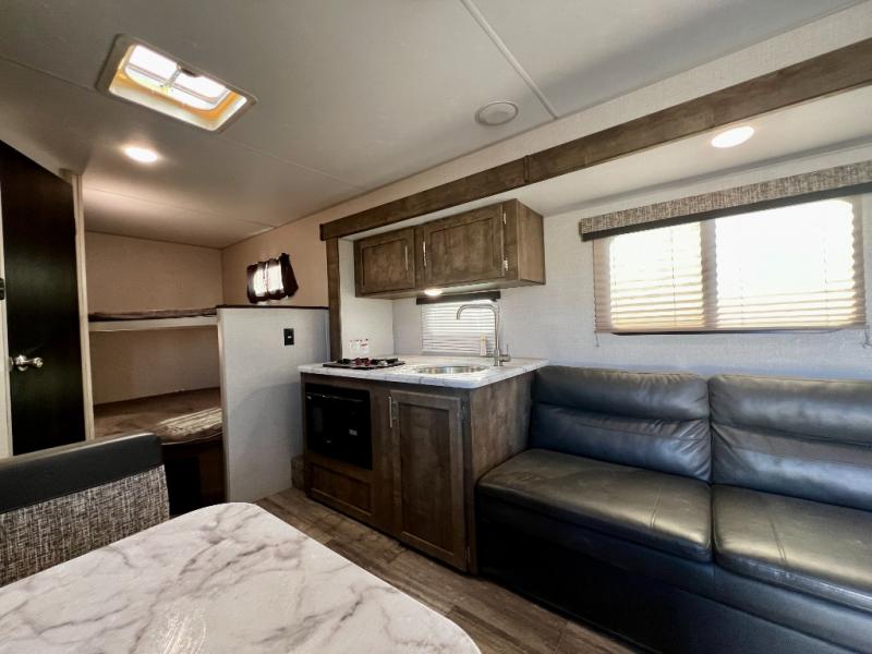 You will enjoy this KZ Escape travel trailer because of its convenient and stylish components for your medium-size family. There are plenty of sleeping arrangements between the queen-size bed, the sofa, the booth dinette, and the double-size bunks. If you need lots of space to keep all of your camping gear, then have no fear because the pass-through storage gives you plenty of it. The best way to end your night will be relaxing underneath the 14' power awning with LED lights.