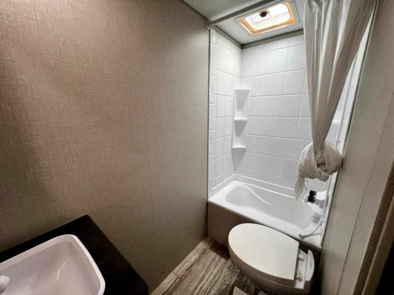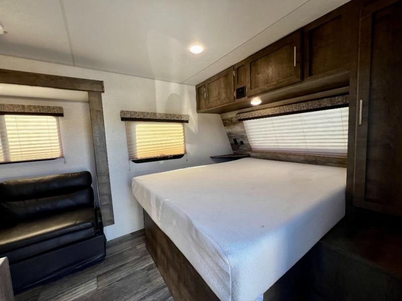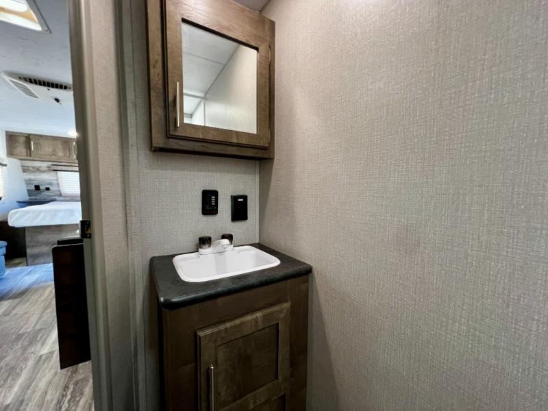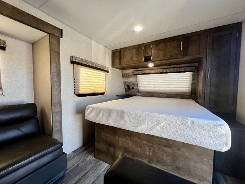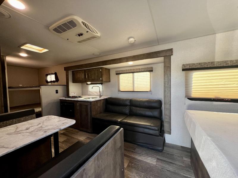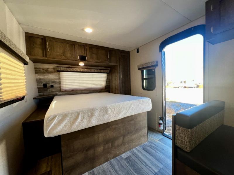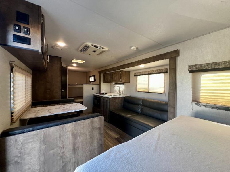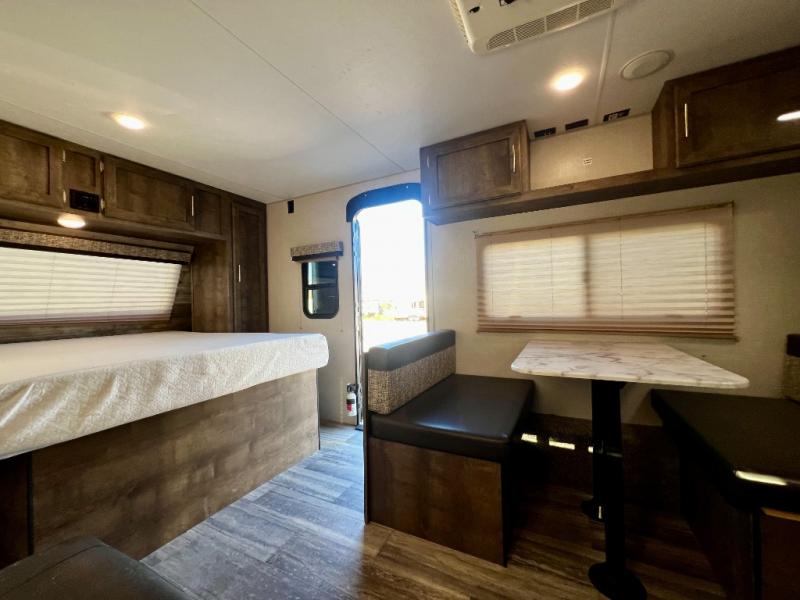 You will enjoy this KZ Escape travel trailer because of its convenient and stylish components for your medium-size family. There are plenty of sleeping arrangements between the queen-size bed, the sofa, the booth dinette, and the double-size bunks. If you need lots of space to keep all of your camping gear, then have no fear because the pass-through storage gives you plenty of it. The best way to end your night will be relaxing underneath the 14' power awning with LED lights.