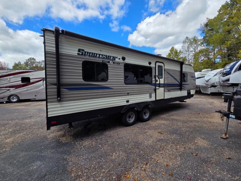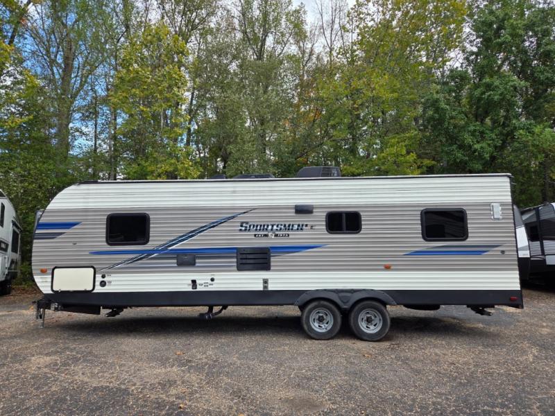 Your home away from home! Sportsmen LE is the most popular series in our affordable Sportsmen travel trailer lineup, with numerous floorplans, all including slideouts and half with bunkhouse designs. A residential kitchen, all the best entertainment features, outside shower and stepped-up décor add to the appeal, and the flip-up entry step provides solid footing. Let Sportsmen take care of the quality, so you can focus on quality time with your family.