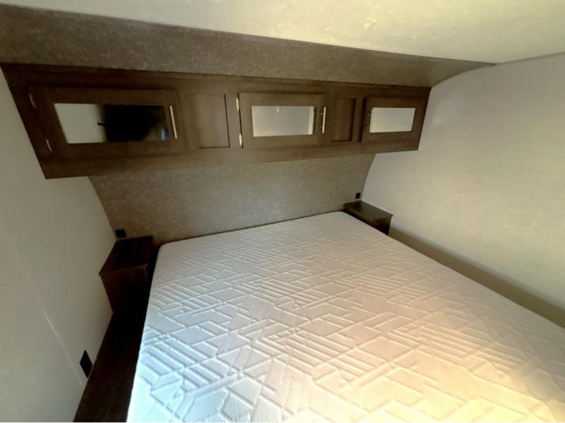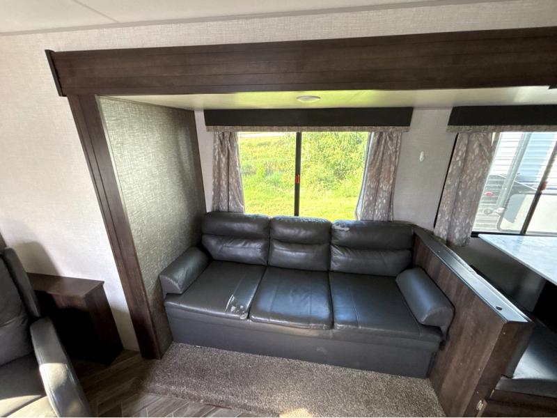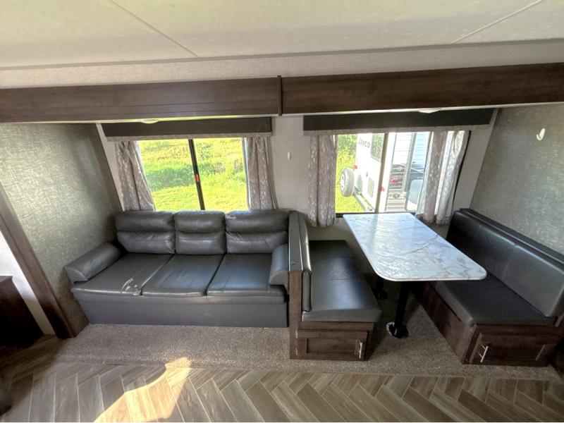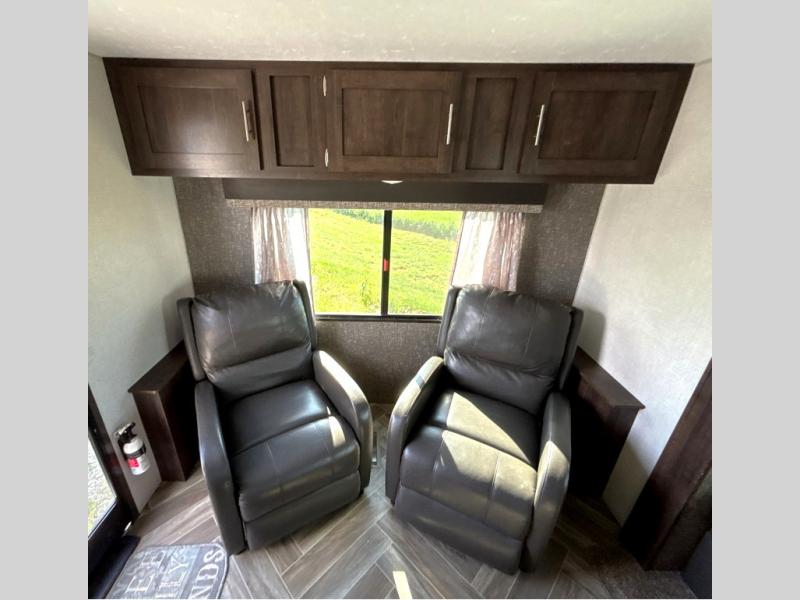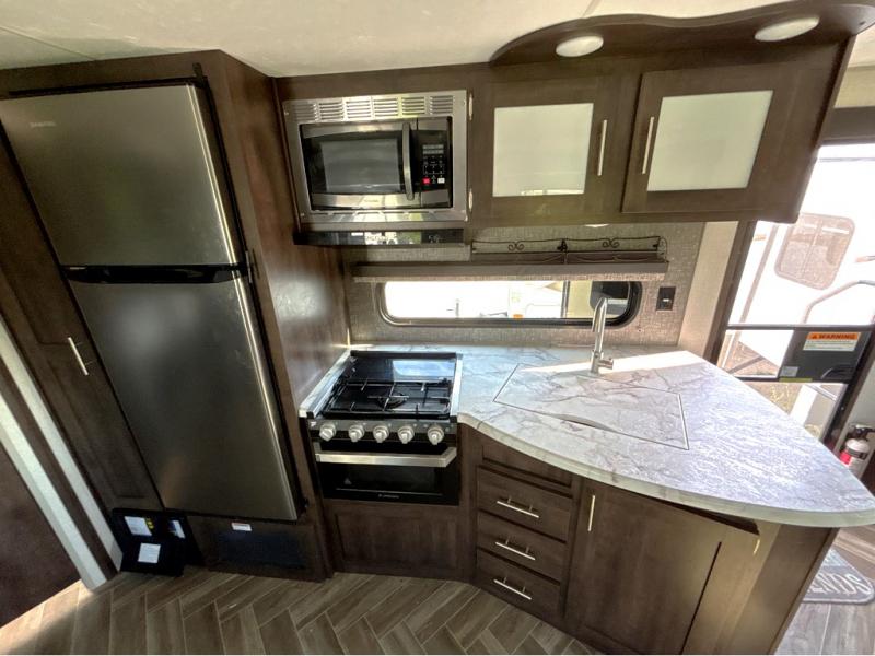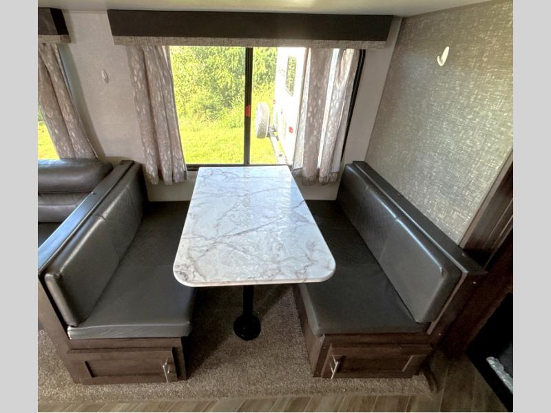 This travel trailer will make you feel like you haven't even left home since it features a rear living area with lounge chairs and side tables for your coffee or book. Enjoy more floor space with a large slide out and here, you'll find the 70" sofa and 42" booth dinette that is perfect for kicking back after a day outdoors. let the chef prepare dinner on the three burner cooktop and everyone can enjoy it outside on the picnic table under the 15' electric awning with LED lights. Mom and dad will love the front private bedroom with a king bed, dual closets for their clothes, and their own exterior entry door!