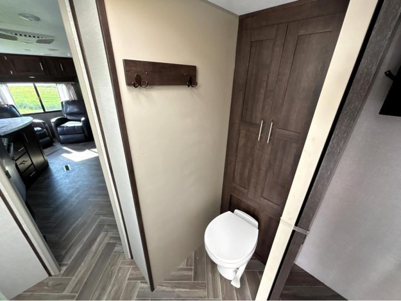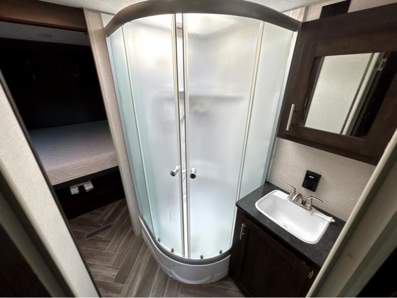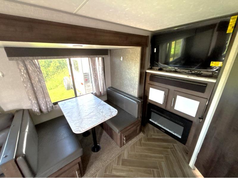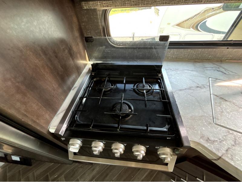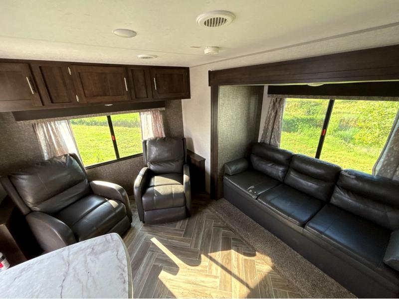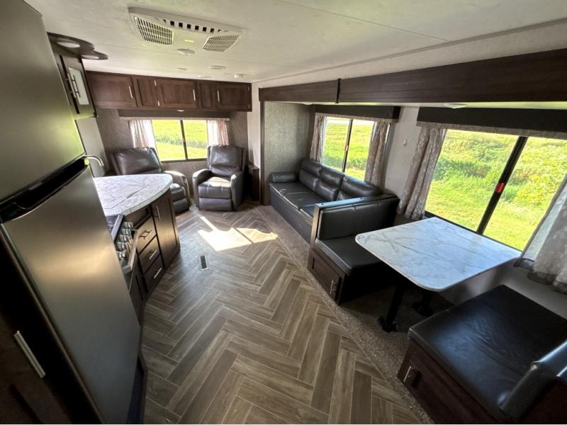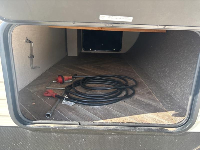 This travel trailer will make you feel like you haven't even left home since it features a rear living area with lounge chairs and side tables for your coffee or book. Enjoy more floor space with a large slide out and here, you'll find the 70" sofa and 42" booth dinette that is perfect for kicking back after a day outdoors. let the chef prepare dinner on the three burner cooktop and everyone can enjoy it outside on the picnic table under the 15' electric awning with LED lights. Mom and dad will love the front private bedroom with a king bed, dual closets for their clothes, and their own exterior entry door!