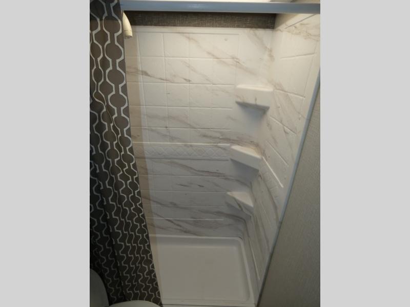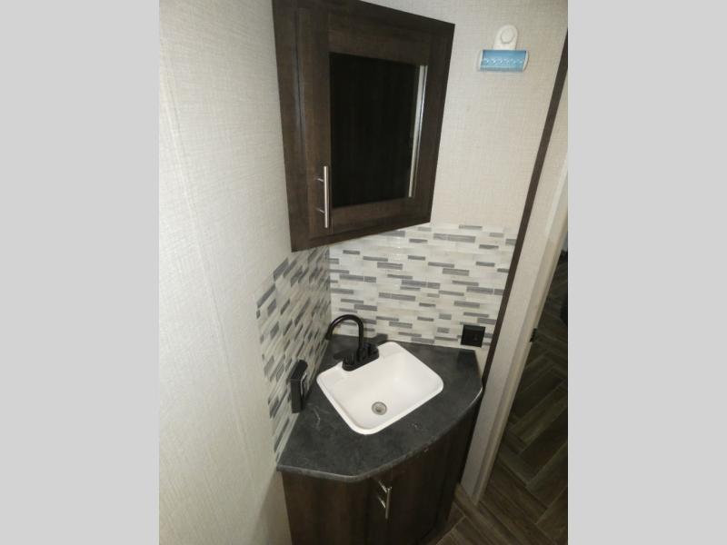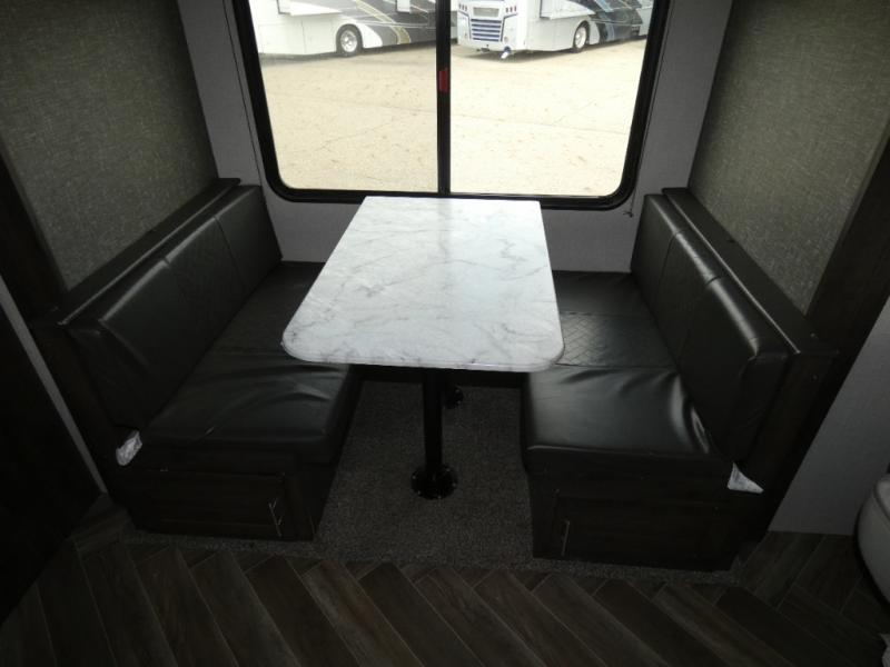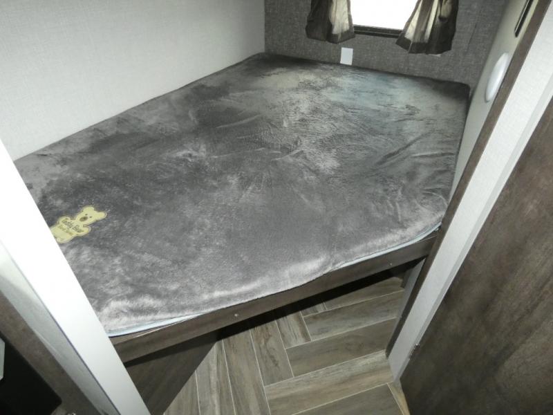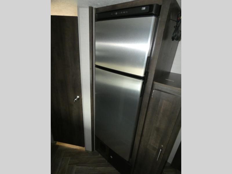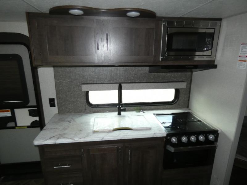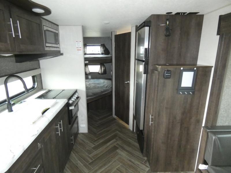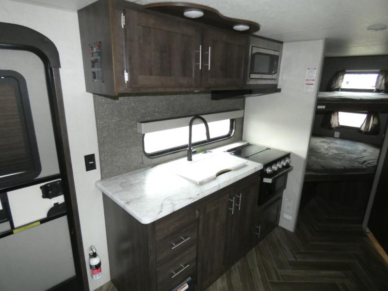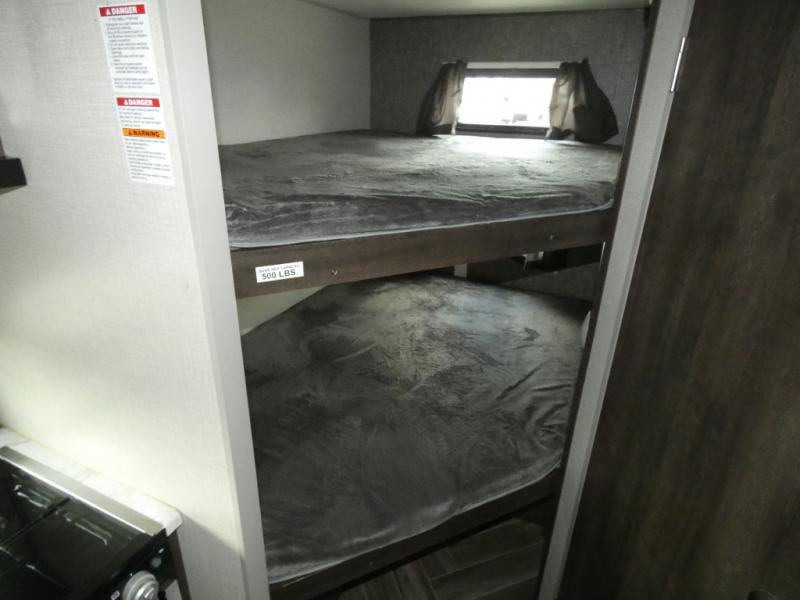 Camping has never been more fun than in this travel trailer that features double-sized bunks for the kids and a front king bed for you and your spouse. The rear corner bath is right next to the bunks for convenience at night and the single slide out provides a little more floor space for the dog to stretch out. The chef of the family will love being able to cook inside on the three burner cooktop or outdoors on the outside kitchen that includes a grill and a refrigerator. Enjoy your meals together under the 18' electric awning with LED lights and after dinner, the kids can play a game at the booth dinette.